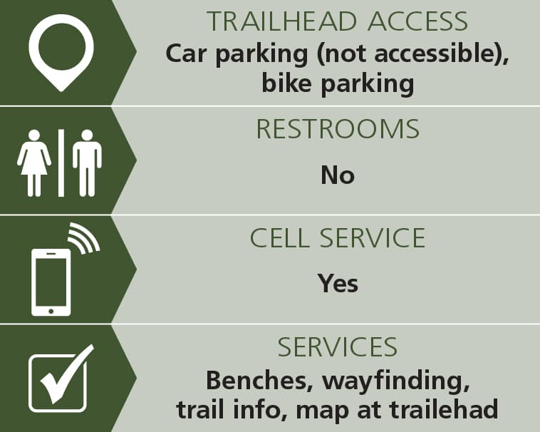 The Burnham Road Access Trail is a natural trail bed with roots and rocks, and crosses a stream. There is a bench closest to the road-end of the trail. Note: there is no designated parking for this access point.