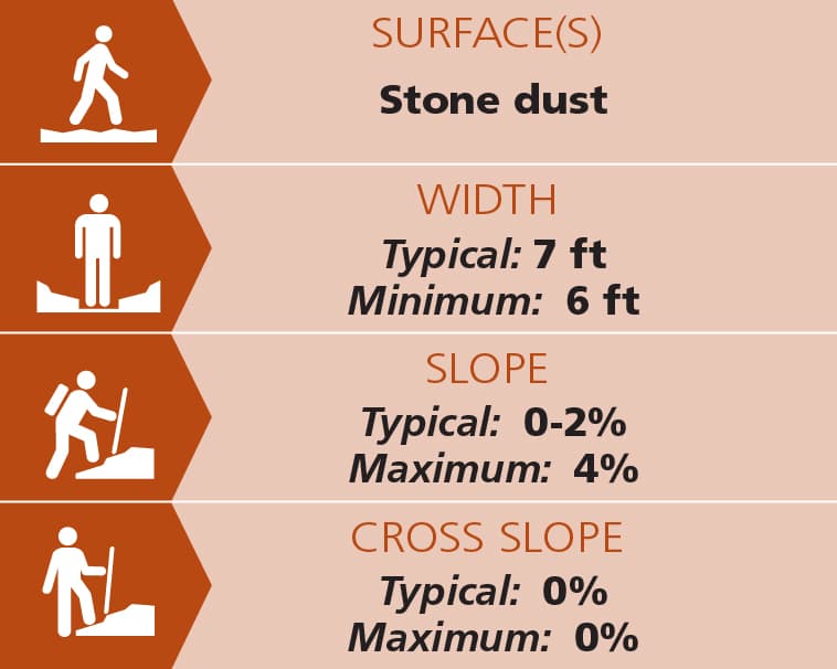The 975-foot (~0.2-mi) pathway circling the park varies between 6-8 feet wide, with a minimum width of 6 feet. It has a deep gravel base topped with stone dust that makes it easier on the joints than pavement. There is a slight grade uphill in both directions heading from the kiosk, reaching up to a maximum of a 4% grade. The rest of the path is a mostly level 0%-2% grade. There are numerous benches around the perimeter on which to rest along the way.