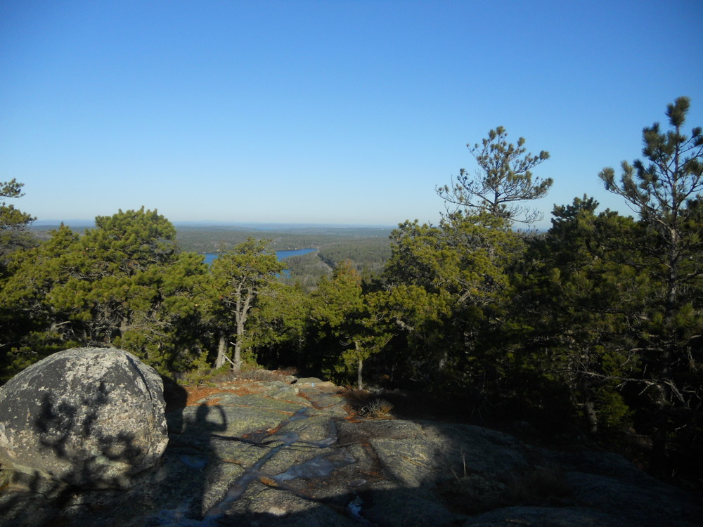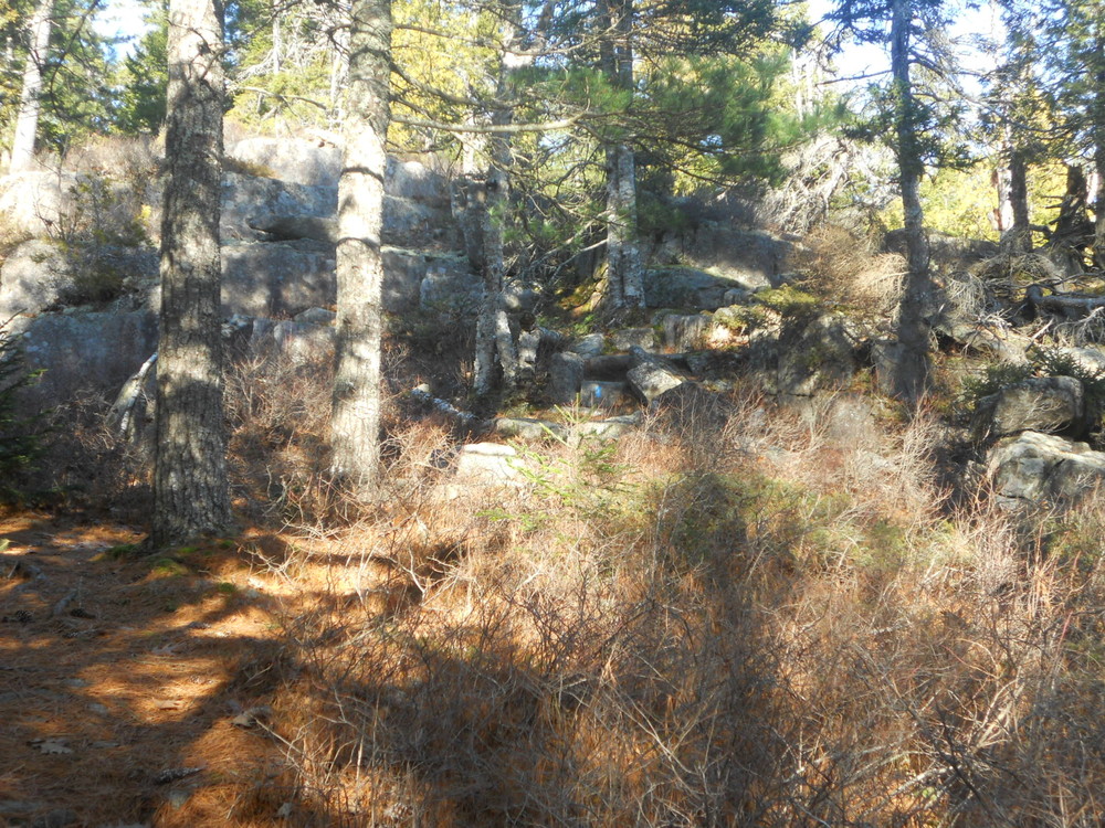 This trail rises quickly on open granite. At the junction of the St. Sauveur Trail and the Acadia Mountain Trail, the hike can be taken for a loop in either direction. Both directions have steep ascents and descents on the East faces. This description takes the St. Sauveur Trail south (right) toward St. Sauveur Mountain. The trail ascends gradually through the forest with an occasional view of Echo Lake to the north. Although the summit of St. Sauveur Mountain does not have a view, an impressive view from the Valley Peak Trail atop the cliff overlooking Valley Cove and Somes Sound is just minutes away. Just past the summit a short connector trail to the left leads to the Valley Peak Trail and the view. Turning north (left) the trail continues to provide nice views before a steep and rugged descent through the forest. If you go straight past the summit on the St. Sauveur trail, you will reach summit of Valley Peak. A return to the loop via the Valley Peak trail adds 0.7 miles. Descending the mountain, there is an open granite section that is not recommended in wet weather. At the next intersection the hike continues straight on the Acadia Mountain Trail. To shorten the loop, a left on the Man o' War Brook fire road will lead back to the Acadia Mountain Trail. A left then leads back to the beginning of the hike.