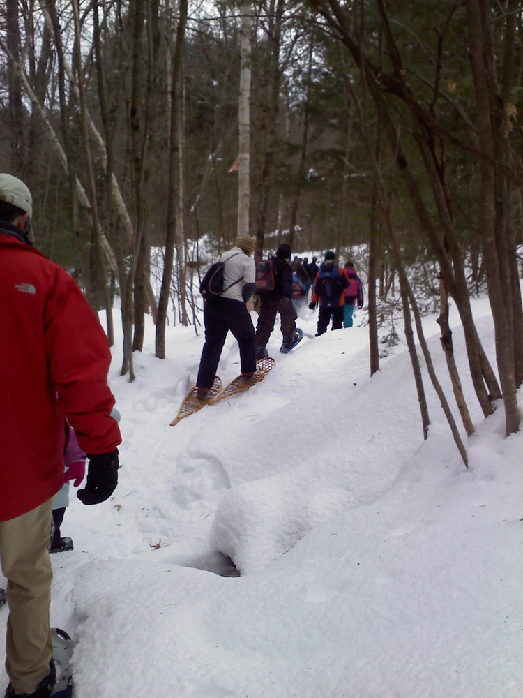 The Homestead Trail (ungroomed) -- 4.5 mile loop with a 2.6 mile option -- provides riverside hiking meandering past homestead foundations and along the old river road. Snowshoers can begin from the northern parking lot to the Picnic Meadow (1.1 mi), from there you can take the Harrington Path and either Old River Road Trail or Porcupine Trails back to the parking area or to extend your hike, continue south on the Homestead Trail past the Picnic Meadow to the juncture with the Old River Road Trail, which leads back to the main entrance (1.8 mi). Other allowed uses on the second half of the Homestead Trail include cross-country skiing (ungroomed) and along the Old River Road Trail, uses include snowmobiling (groomed) and cross-country skiing (ungroomed).