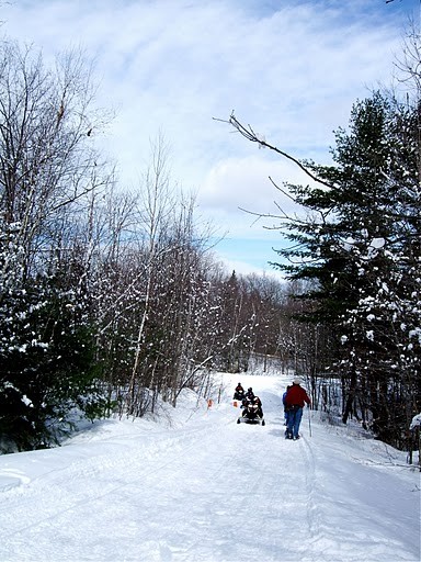 For an extensive snowshoe experience, venture to the Ridge Trail (ungroomed) -- 6.9 mile trip -- which provides a scenic overlook of the river. This trail is reached by following the extended Homestead Trail to the Old River Road Trail (2.0 mi). Turn left, proceed over a bridge, turn right and continue up the Ridge Trail (1.0 mi.) to the outcrop overlooking the river. Turn left and descend steeply toward the river on the Ledges Trail (0.4 mi). Turn left on the Old River Road Trail and return 2.25 miles to the Picnic Meadow, and on to the parking area via the Homestead Trail (1.1 mi). Other allowed uses on the Ridge Trail include cross-country skiing (ungroomed), and along Old River Road Trail, snowmobiling (groomed) and cross-country skiing (ungroomed).