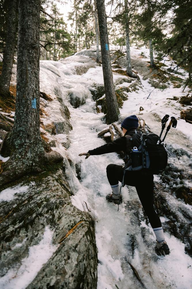 From Wilton, follow ME-156 for approximately 9 miles to the trailhead. Unofficial parking is on the left side of the road along a wide, sandy shoulder. The trail starts at a red sign.