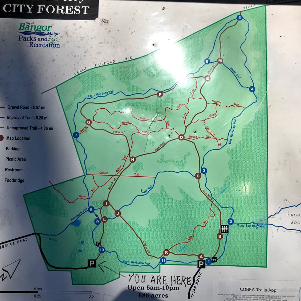 Officially called the Rolland F. Perry City Forest, but commonly known as Bangor City Forest, this vast network of trails lies on the City's northern border with Veazie and Orono and encompasses more than 680 acres of wildlife habitat and working forest. Trails vary in length and difficulty with more than 4 miles of gravel access roads providing flat easy walking and more than 9 miles of "secondary" trails for running, hiking, biking, snowshoeing, and cross country skiing.
