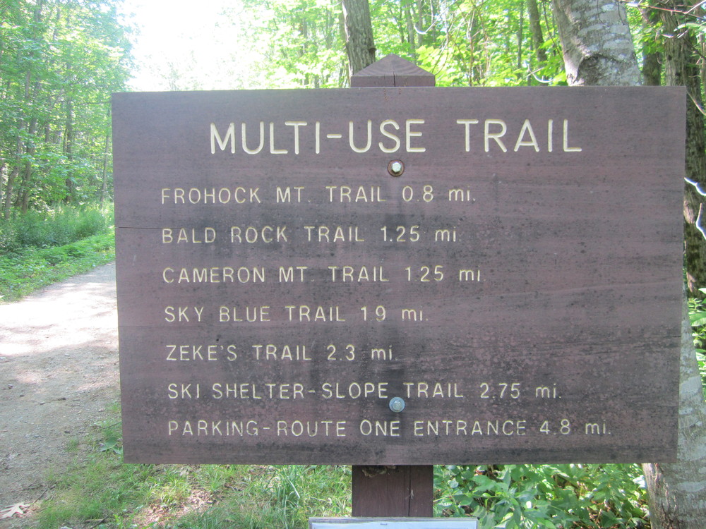 Cameron Mountain Trail (1.9 miles, moderate): Heading west from the Multi-use Trail at the intersection of Bald Rock Trail, this delightful trail, open to hiking, biking, horseback riding and snowmobiling, gradually ascends through old farmland and past blueberry fields. Cameron intersects with Zeke's Trail offering access to the interior of the park and back to the Multi-use Trail. Alternatively, hikers may utilize the Sky Blue Trail as a return route.