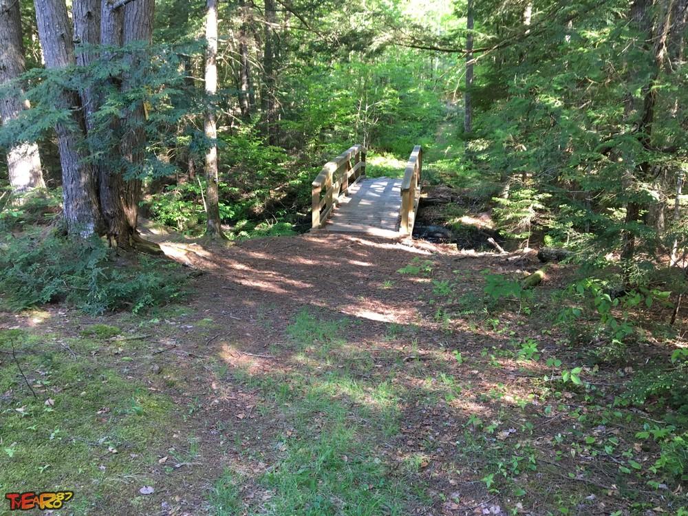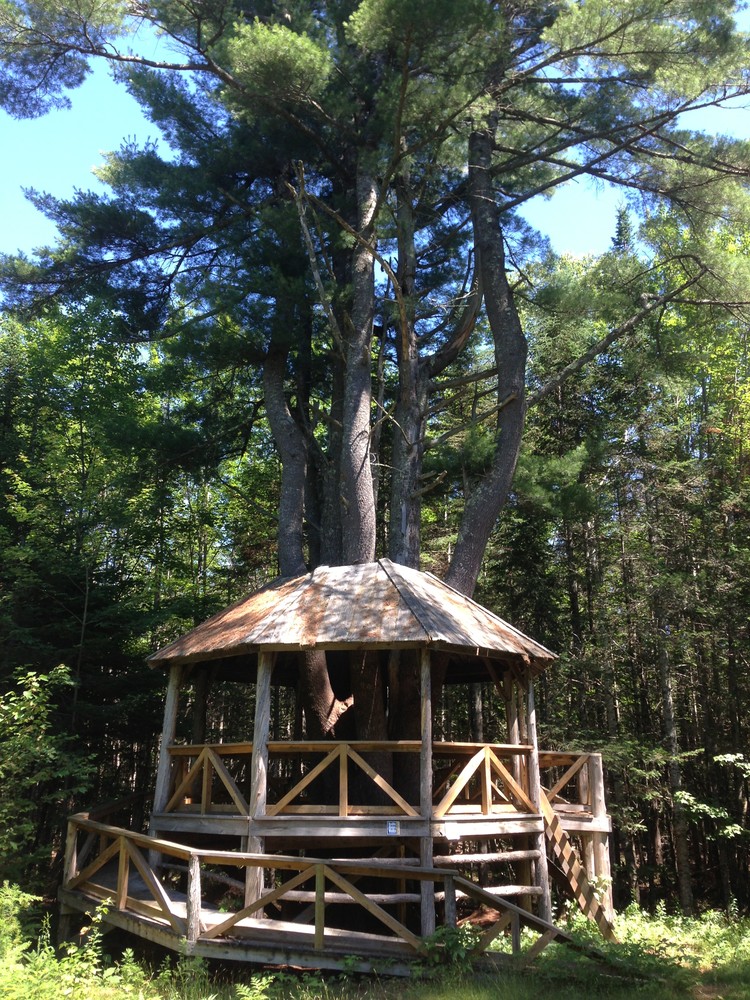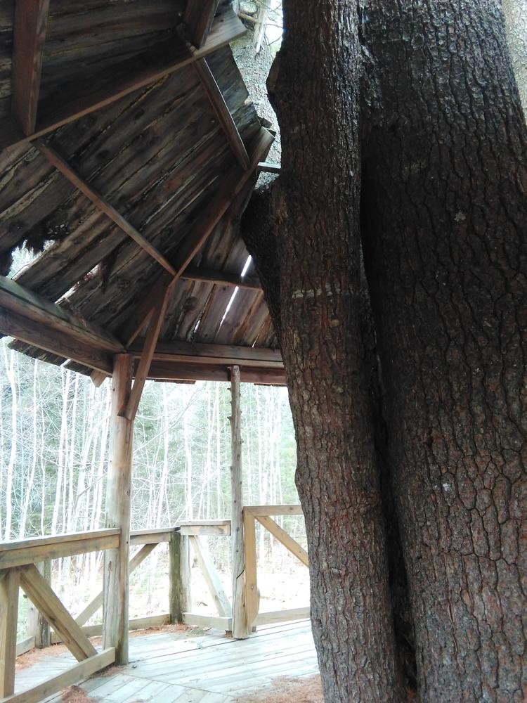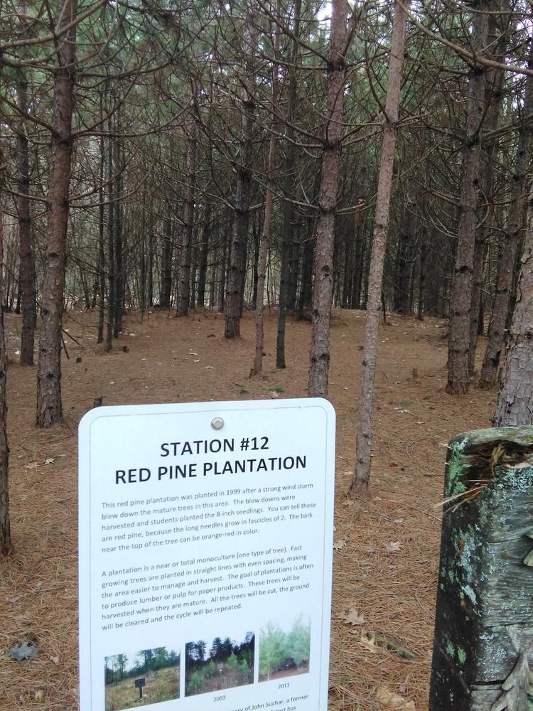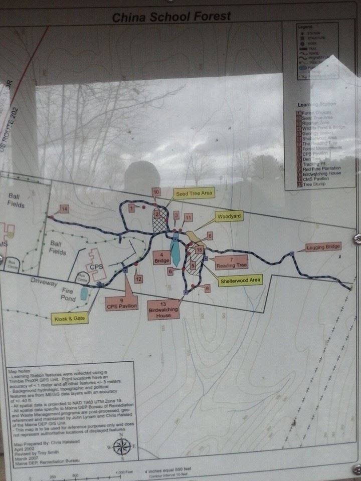 The China School Forest contains approximately 50 acres of managed forest-land. There is a network of trails throughout the area with two basic loops (approximately .25 mile each) and one trail that runs the length of the property (approximately .75 mile, one way). The trails are easy for school children to walk. They were created by skid roads from two forest harvests in the mid-1990's and have a gentle grade. The trails have approximately 15 different "outdoor classroom" areas that highlight forestry techniques or natural features, including a small pond and walkway, a small outcrop of bedrock,a stream and a large tree-house built around a large white pine. Interpretive signs are posted at most of the outdoor classroom areas.