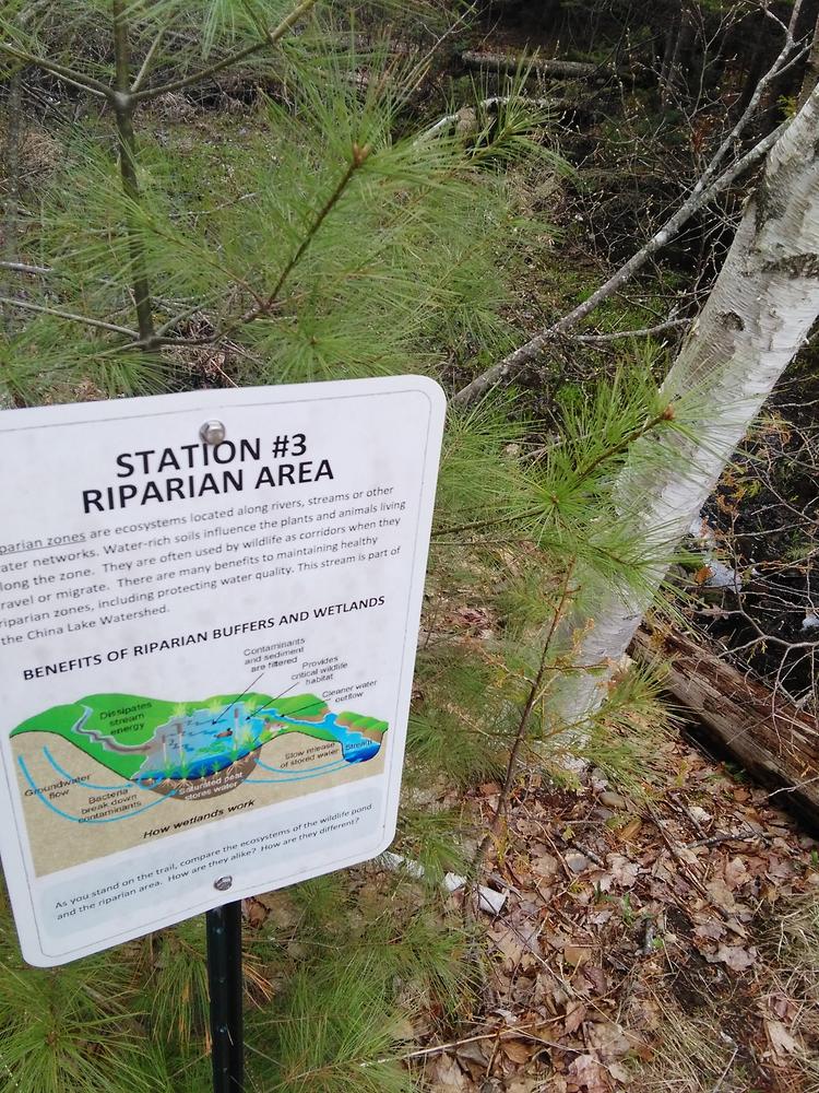 The China Primary School trailhead is located to the right of the school, leading east from the bus circle. Kiosks at each trailhead have a large posted map of the trails. Paper maps are usually located at the Primary School kiosk. Parking is located in the school parking lots or on the gravel parking lot by the ball fields.