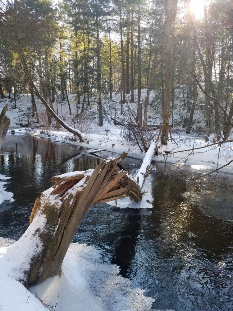 The Corn Shop Trail follows Martin Stream a short way on a relatively wide and easy to follow natural surface path. Along the way there are towering white pines and several places offering access to the stream. The trail continues until it peters out after a bend in the stream. Returning along the path to the road provides a 0.3 mile round trip.