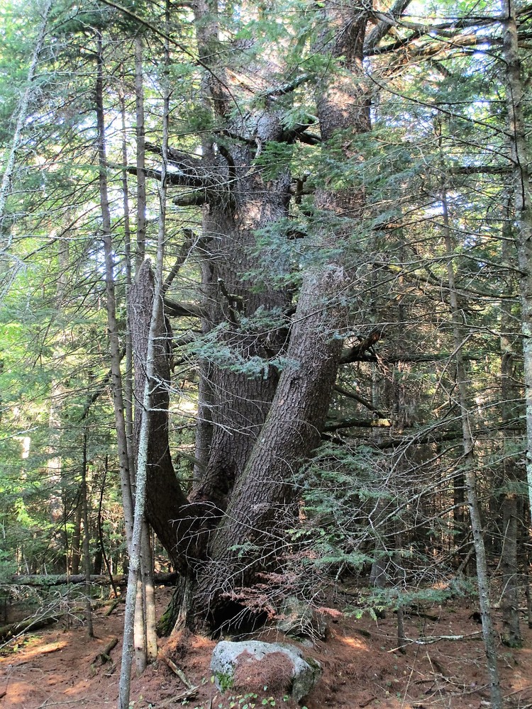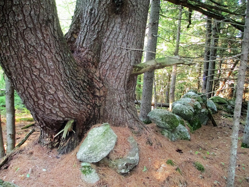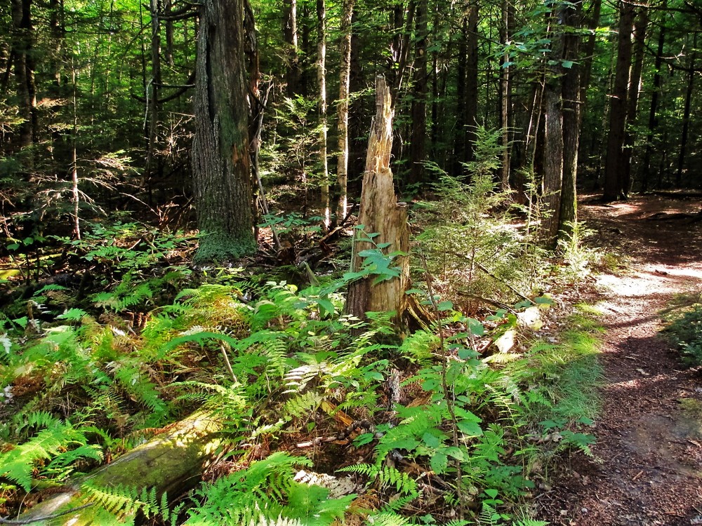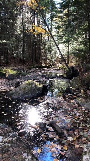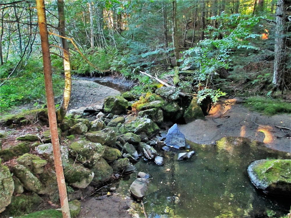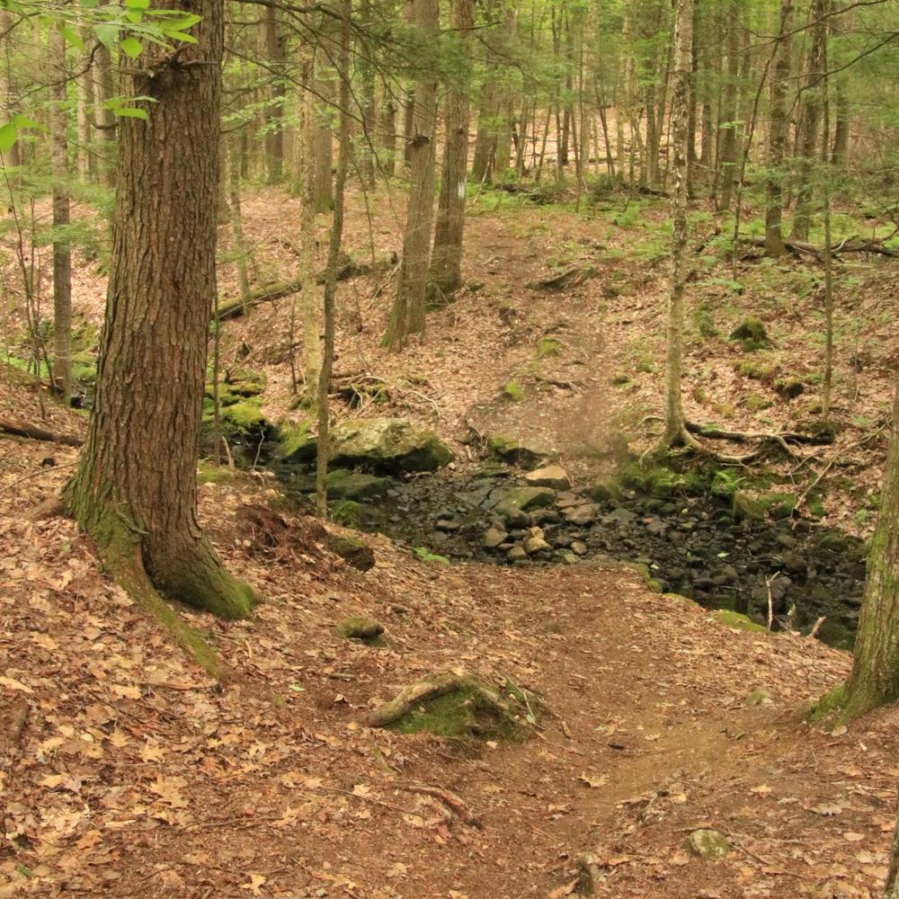 The southern network of trails departs from the White Trail near its terminus and features the Purple and Orange trails. The Purple trail skirts the property boundary near old stone walls and ancient pines before descending gently to the historic ice pond dam on the western property boundary. The old ice pond has now been successively overgrown by forest, but a brook remains.