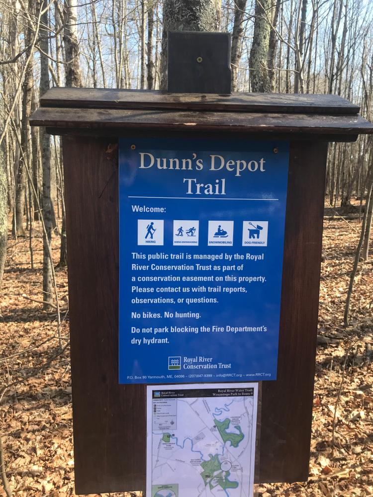 Royal River Conservation TrustParking for Dunn’s Depot Trail is available at the town’s ME-9 boat launch; the trail begins on the opposite side of ME-9, leaving the shoulder of ME-9 or leaving from the paved staging area for the Fire Department’s dry hydrant on the edge of the river. Do not park in the dry hydrant area.