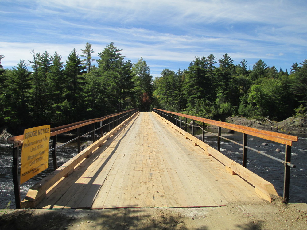 The put-in below Whetstone Falls is accessed from the parking area just below the logging bridge. A pit toilet and tent site on the opposite side of the road are available here. For those paddlers who are continuing downriver from the Thoreau-Wabanaki Trail, either run Whetstone Falls (Class III) or take the short portage on river left and put back in below the bridge.