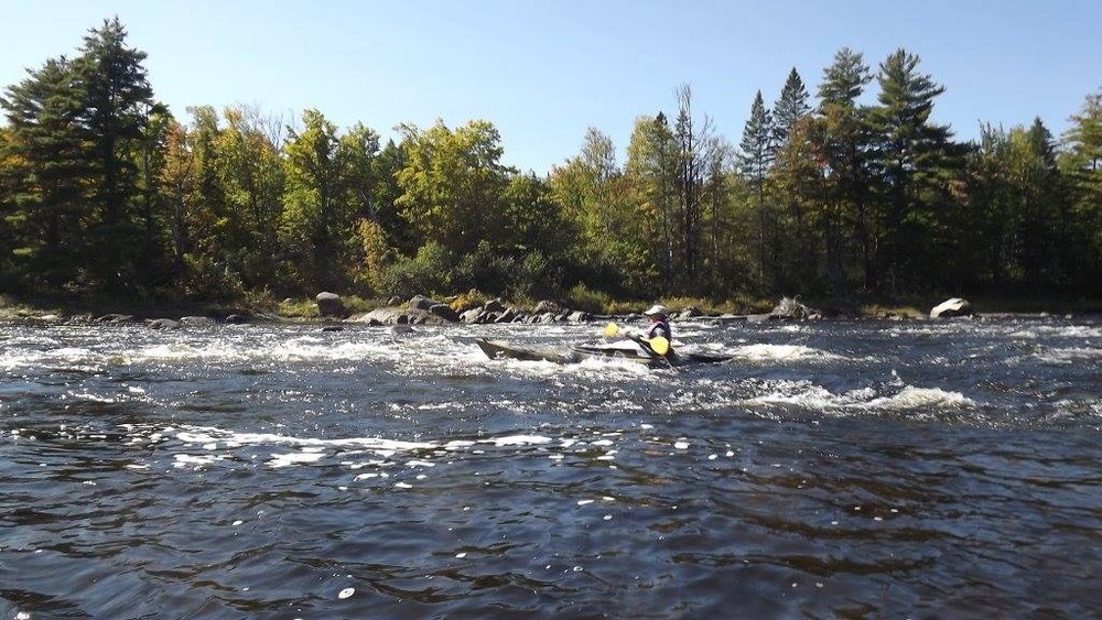 To continue downriver on the East Branch of the Penobscot between Grindstone and Medway, either run Grindstone Falls (Class II+) or portage around the falls on the Grindstone Falls Trail.