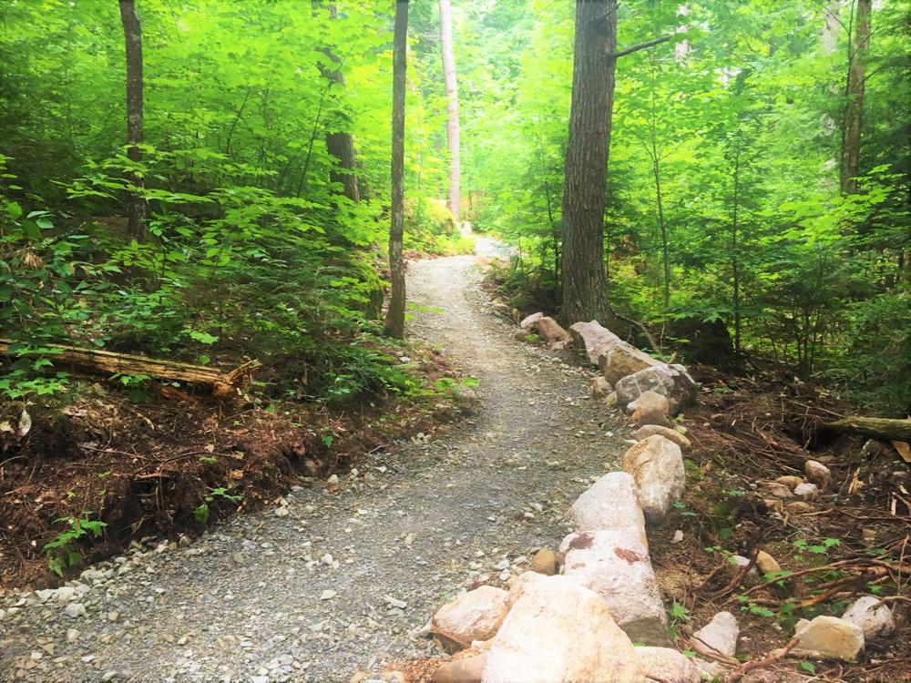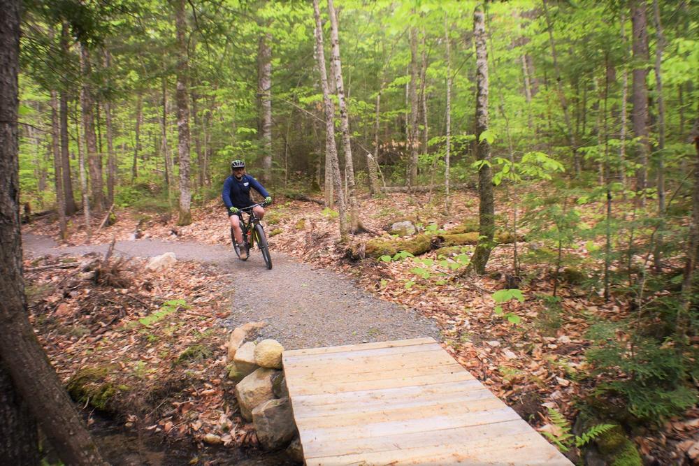 Most of these three- to four-foot wide single track trails are accessible to novice riders. They are surfaced with locally-sourced crushed shale mixed with hardpan soil, and loop through a variety of forest types. For those looking for a challenge, a more difficult 0.6 mile trail cuts through the middle of the network. The mountain biking trails were designed by the International Mountain Bicycling Association.