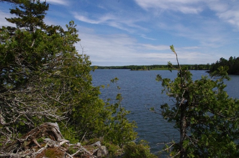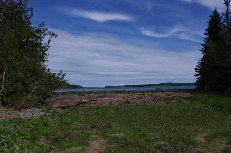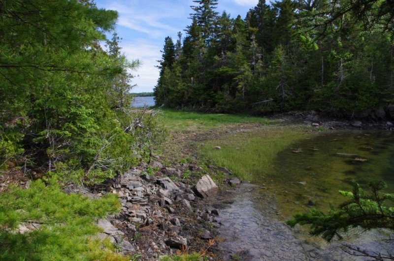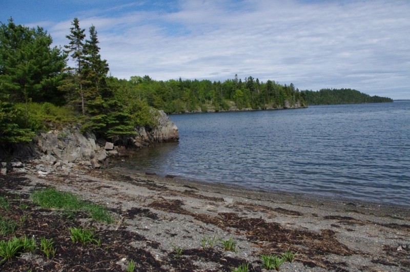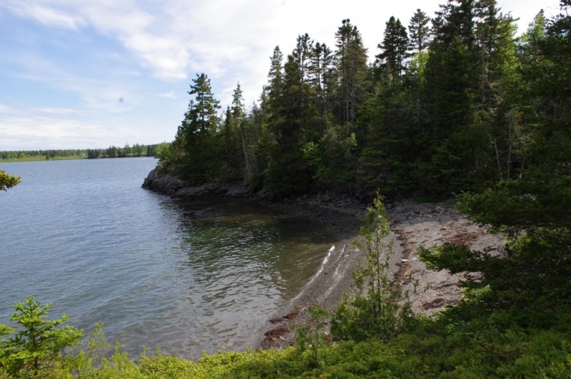 The trail continues uphill, marked by blazes, to the top of a knoll where it crosses a small clearing and scenic overlook. It then descends gradually over rough ground through a spruce-fir-cedar woods with wet areas and many roots, to emerge at Southern Beach at the northwest corner of Sheep's Cove. Here are a pebble beach and pocket saltmash, with views southeast over the Pennamaquan River to Leighton Neck. Continue on the Devil's Well Trail to Western Point for views down the Pennamaquan River to Cobscook Bay. This trail loops back to Sheep's cove.