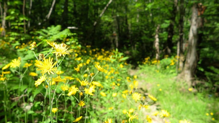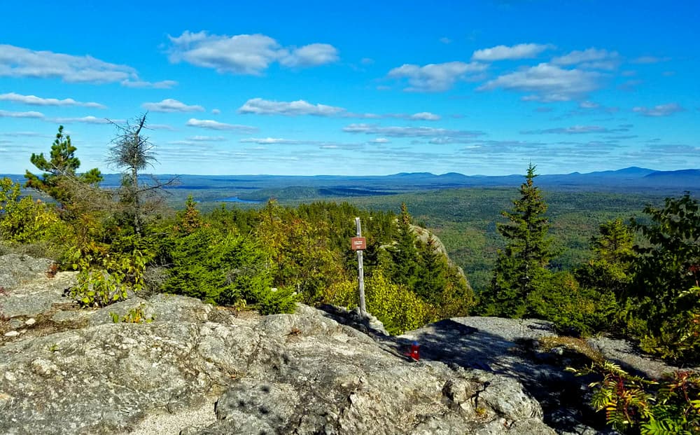The trail begins climbing gradually along an old tote road. A small brook is crossed at 0.1 miles. After 1.2 miles of gradual climbing the trail reaches a junction at a level area southeast of the summit. To the left is a 0.3 mile side trail leading east to a fine viewpoint overlooking the East Branch valley to the east and south. To the right, the summit trail continues for 0.2 miles past the junction and emerges into a mix of trees and open ledges with limited views of Matagamon Lake to the north, Mount Chase to the east and The Traveler to the southwest. The Horse Mountain Trail ascends 796 feet over 1.4 miles on its way to the summit.