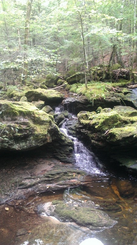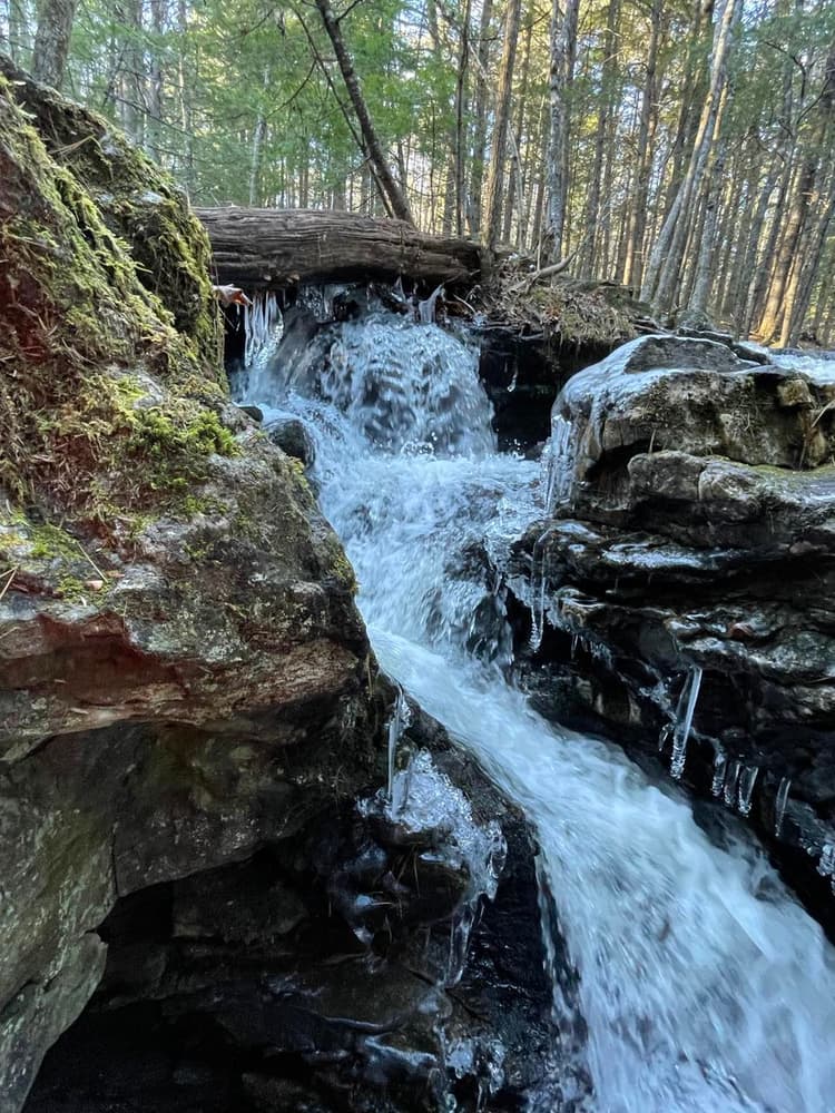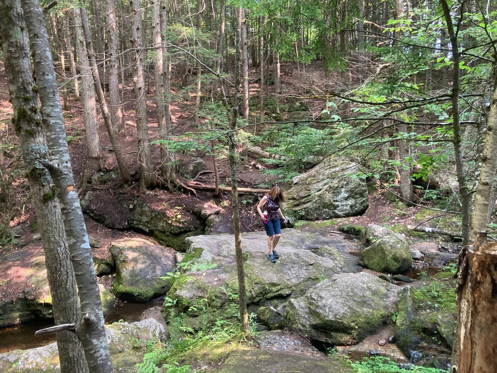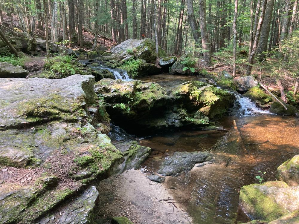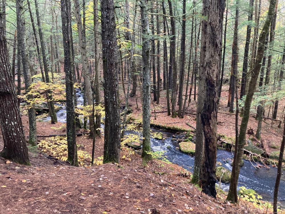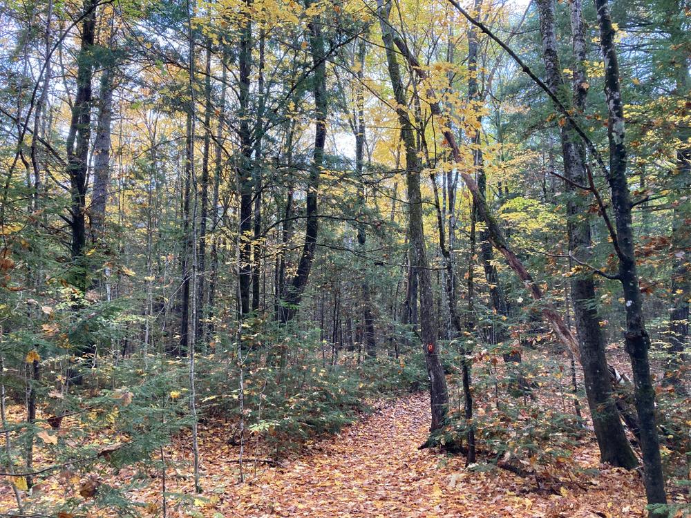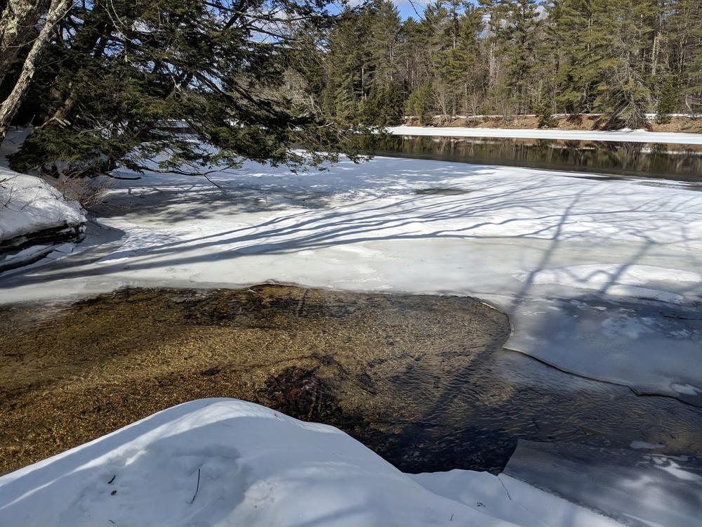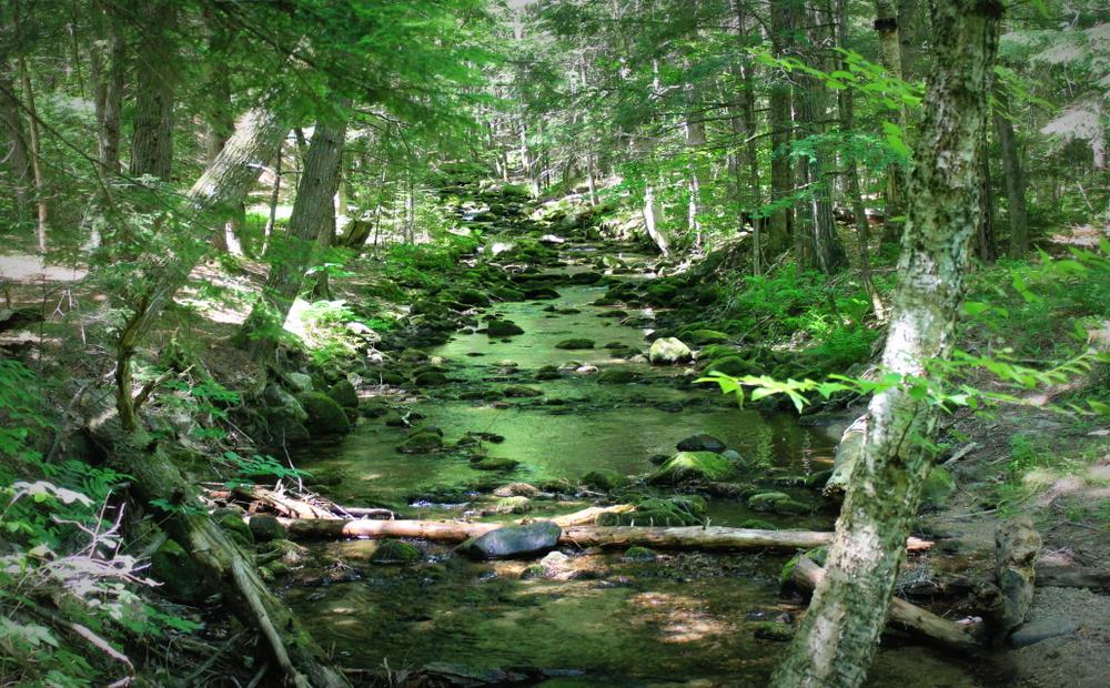 To enter the 20-acre preserve, go 250 feet down the right-of-way on Olives Way (as described under Trailhead), and at the sign, angle to the left and walk an additional 500 feet. A stonewall marks the boundary line of the property. A signpost points to the loop path. Small wooden signs with a turtle logo mark the trail. It takes approximately 45 minutes to walk the loop trail that passes the old dam, Pease Brook, and the Saco River, and then returns through the woods.