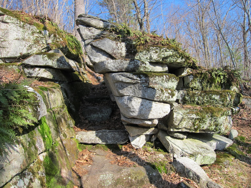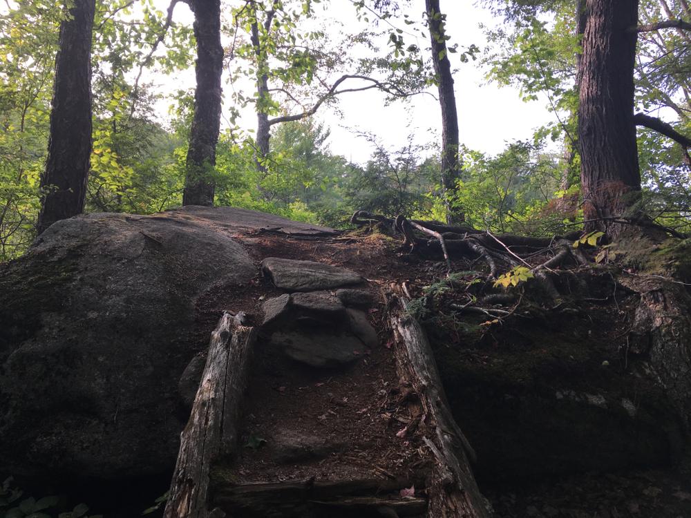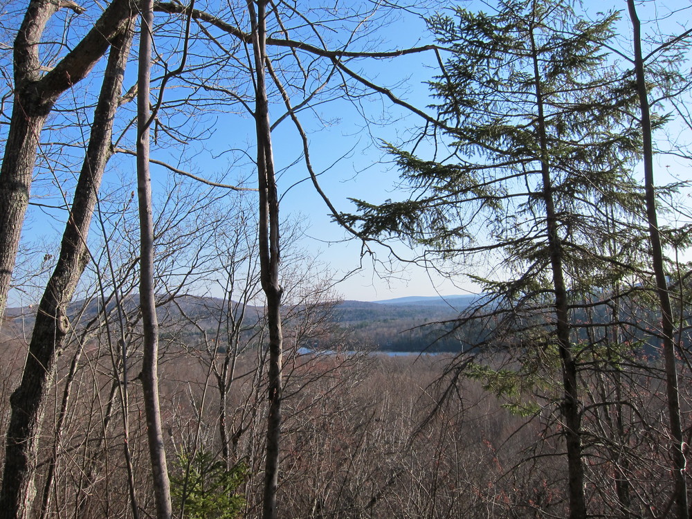 The trail, marked with blue blazes, leaves from the north side of the parking area, winding westerly and briefly paralleling an old logging road. At 0.2 miles there are nice views from the south end of Watson Pond from atop a large boulder. The trail crosses the inflow for Watson Pond, briefly follows what was a logging road, then, after veering to the left, narrows and begins climbing moderately to the west. The trail eventually turns right (north) after crossing a short, wet area and follows the ridgeline through a rock field where there are views to the east of Watson Pond, Mount Phillip, and French Mountain. The trail cuts directly through and over some large granite slabs at 0.9 miles and continues on to a sparsely wooded summit area with views to the east and south through the trees at 1.1 miles.