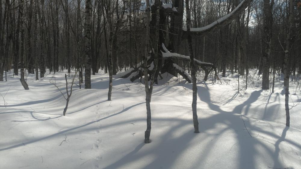 Birch Trail (2 miles, marked in blue): Leaving the Central Trail, the Birch Trail crosses the road into a wood yard, and then loops around a ridge through hardwood and evergreen forests.