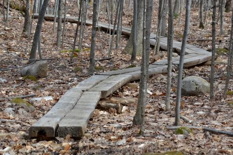 The Ledges Trail (1.4 miles) allows for a longer loop connecting the Tower Trail with the Blueberry Trail on a ridge line north of the summit. The trail winds through a dense forest of hemlock and mixed hardwoods descending to a point at 590 ft on the northern ridgeline of Mt. Pisgah. The trail then heads south and crosses a small stream with impressive ledges to the west of the trail.