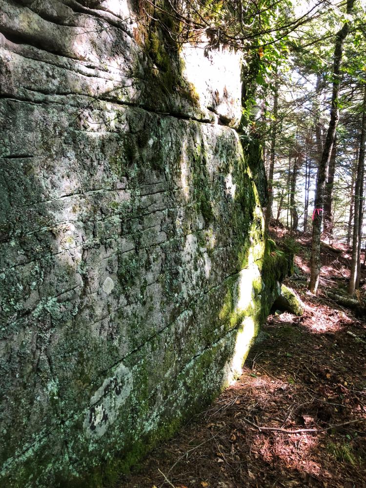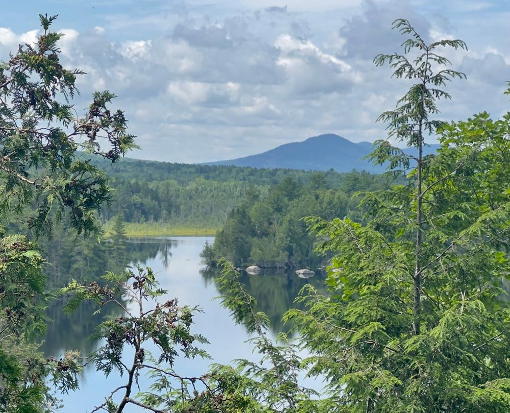 Beyond the overlook, the trail continues and drops to the pond shoreline. It passes an attractive open forest stand and large glacial boulder as the pond starts to come into view. The shoreline peninsula area where the trail terminates is dominated by red pine and is open for nice views and fresh breezes. This peninsula area, owned completely by the Bureau of Parks and Lands, makes for an attractive lunch spot (no amenities such as picnic tables, etc. are present). By exploring the shoreline, hikers can spot several more landmarks such as Blue Ridge and Elephant Mountain.