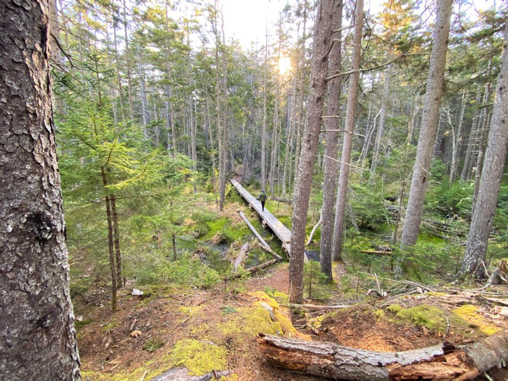 The trail begins on a 0.2 mile spur that leads along a ridge, then crosses primeval wetland, to meet up with a loop trail. The 0.8 mile loop travels through the woods and along the shoreline of the cove. It is recommended to walk the loop in a counter-clockwise direction to best take advantage of the views.