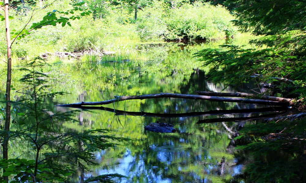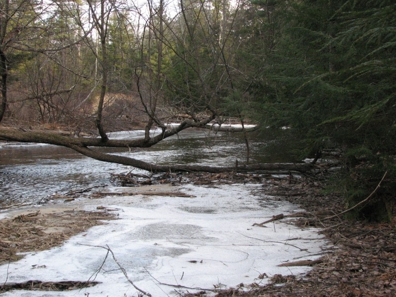 Descending from the parking lot, the trail winds among tall conifer trees and loops around following the nearby brook most of the way. The trail provides several scenic overlooks of the brook as well as access to a gravel bar that is sometimes submerged during high water. There are efforts underway by the school to add interpretive signs about the ecology of the trail.