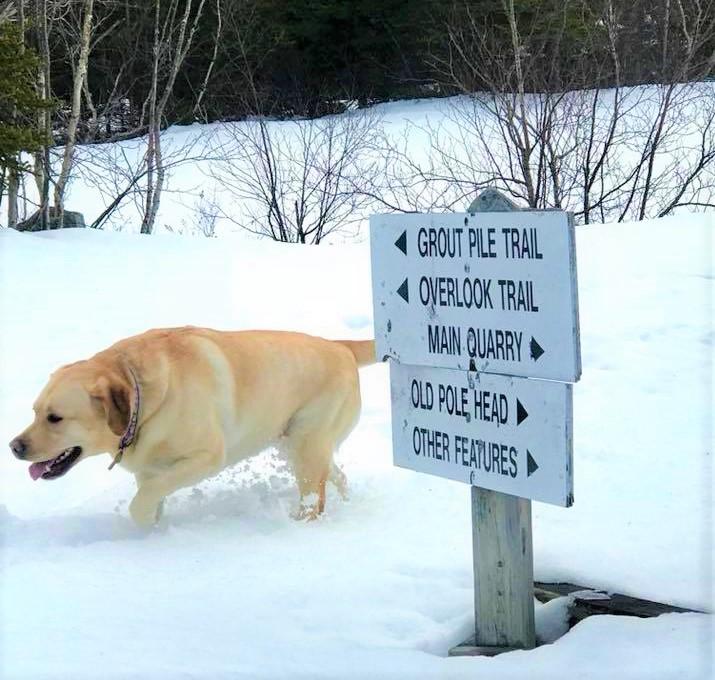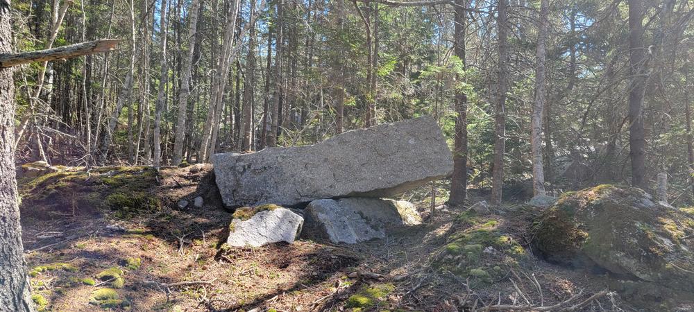 0.25 miles up the quarry road is the primary junction. The trail to the right leads to a viewing platform. The trail to the left leads to historic structures of note atop the quarry; the Grout Pile Trail (blazed blue) skirting the edge of the quarry; and the Overlook Trail, which winds along the foot of the quarrying operation to the modest Webb Cove overlook.