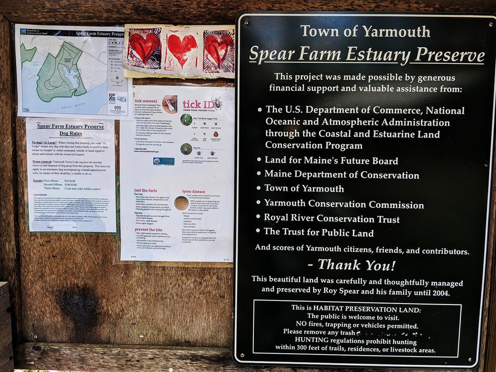 Owned and managed by the Town of Yarmouth, the property is protected by a conservation easement held by the Royal River Conservation Trust. The 55-acre preserve was conserved in three phases, along with an upriver 17-acre parcel. The most recent phase of conservation was a gift of land in 2011 by the Cattell family. The first two phases, in 2004 and 2005 were made possible by remarkably generous donations from neighbors and Royal River Conservation Trust members, the Land for Maine’s Future program, federal funds, and the Trust for Public Land. A 17-acre nearby section of salt marsh, just upriver, was donated to the Royal River Conservation Trust by Ann Donaghy and Nancy Gunzelmann in 2004.