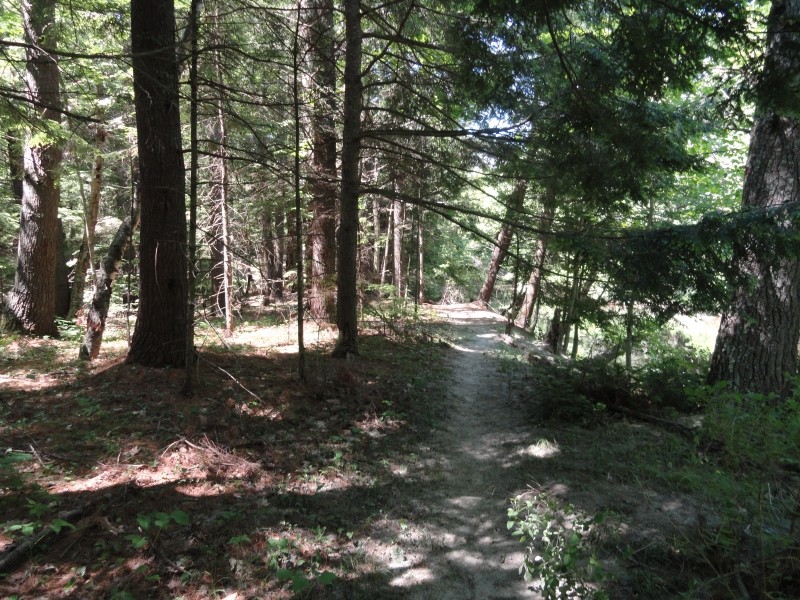 From Summer Street the trails lead back into the woods and briefly converge at an opening with a picnic table before winding their separate ways downhill to Little River crossing a power line as they do. Though not marked, the trails follow mostly wide paths and easy to follow. Near Little River the trails traverse low wooded areas that can be very wet depending on the time of year.