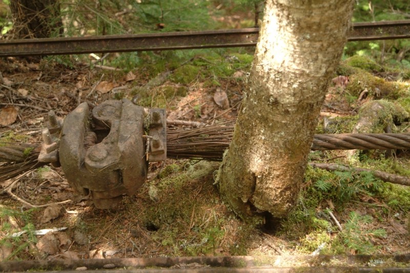 At the southern (Chamberlain Lake) end, the rusted remains of a steam-powered mechanical tramway system sit amidst the peaceful forest next to Chamberlain Lake. The tramway, established in 1902, was essentially a small railroad pulled by a six thousand foot cable loop. Steel trucks attached to the cable carried logs across a three thousand foot passage between Eagle and Chamberlain Lakes. Remnants of this system can still be seen along the trail, which travels across the land dividing Chamberlain and Eagle Lakes.