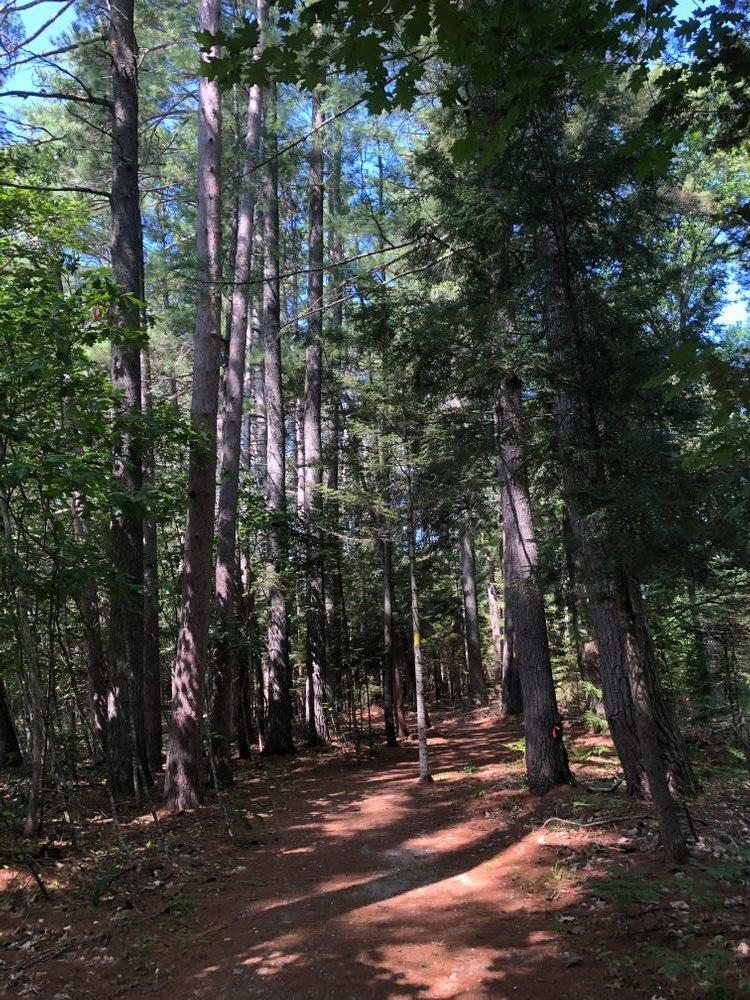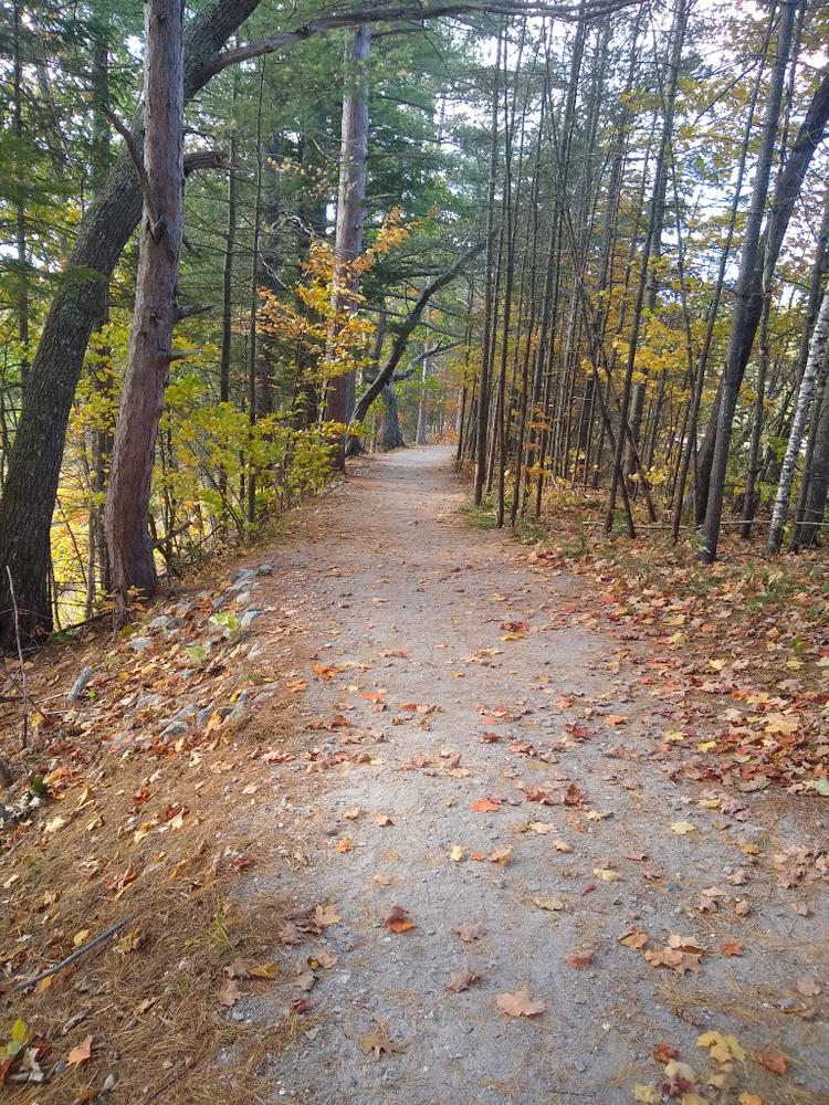 The West Loop is flat with a maximum grade of 2%. It includes a wheelchair accessible picnic table that overlooks the Androscoggin River.