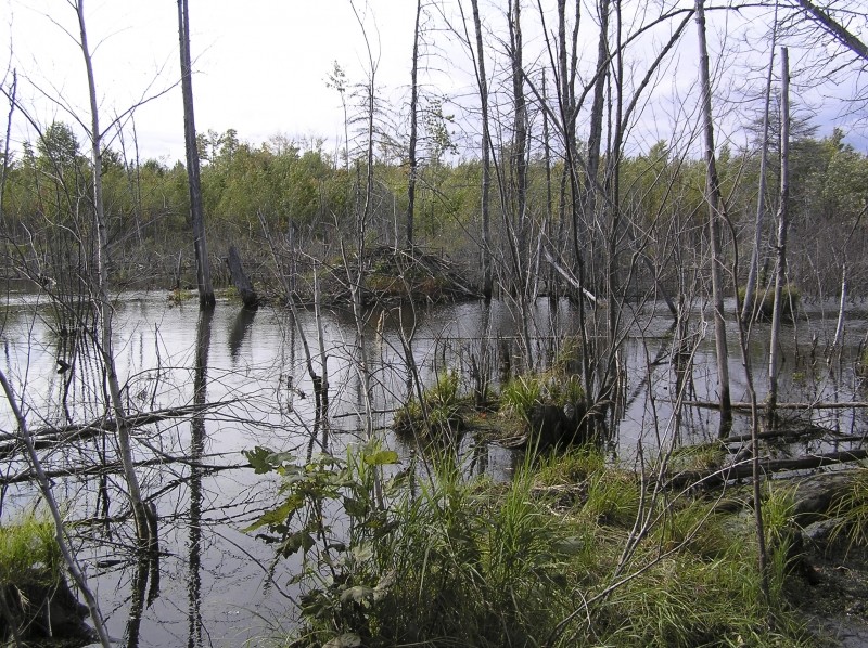 Starting from the Tamarack Trail trailhead, the trail passes through early successional aspen/birch woods. About 250 yards in, there is a large beaver impoundment to the left, with a series of dams and lodges. Bangor Land Trust has installed a successful beaver deceiver to prevent the beavers from damming the culvert running under the road. About 200 yards beyond that, the trail forks and creates a loop (Blue Trail). After about 300 yards the right-hand path curves to the left and follows the bed of the Searsport-Loring pipeline to the old Veazie Railroad bed and a Bangor Land Trust kiosk.
