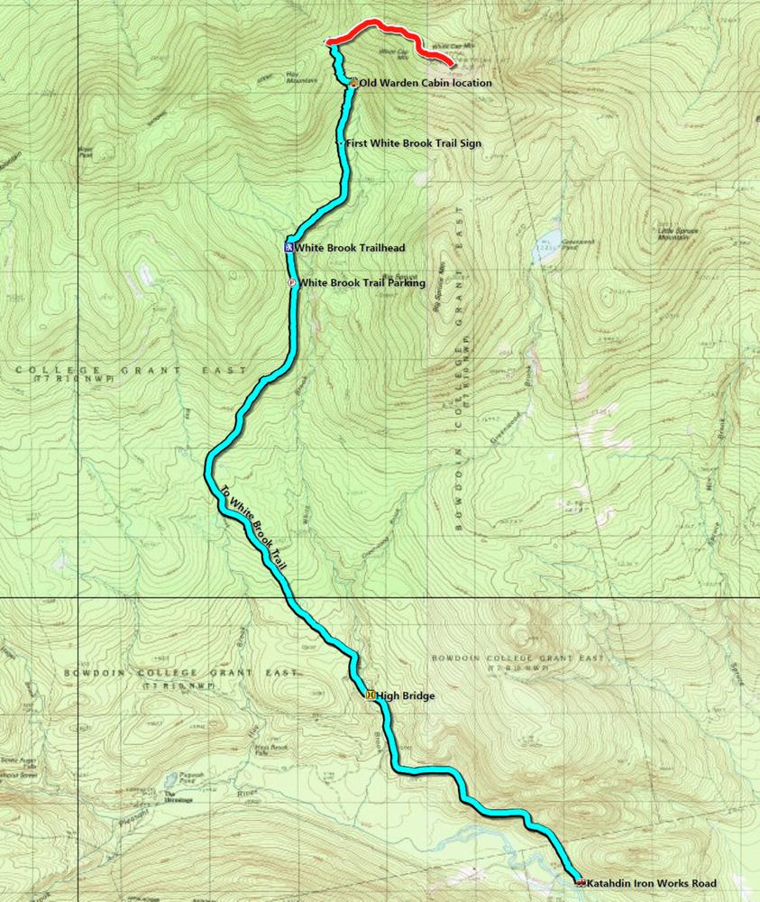 At the end of this road is a small opening where a sign on the left indicates the trail, which is blazed blue from this point to the Appalachian Trail. From this clearing it is 0.5 miles to where an old fire warden's cabin was located, 1 mile to the intersection with the A.T., and 2.1 miles to the summit of White Cap Mountain. As the climb progresses, the forest changes from a mixed growth, to a softwood forest of spruce and fir, and then to primarily balsam fir.