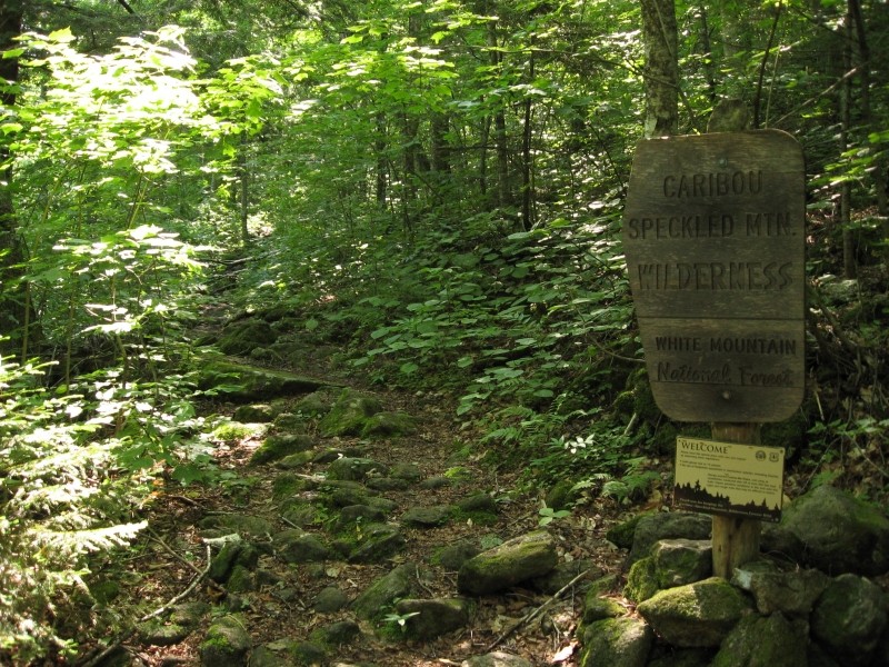 The Caribou Trail and Mud Brook Trail leave from a common trailhead parking area on ME Route 113 between Hasting Campground and the Basin Recreation Area. Both trails use parts of old logging roads to lead hikers through land that has a rich history as farmland and timberland. These trails also travel through part of the Caribou-Speckled Mountain Wilderness, which was designated by Congress in 1990 to be preserved for future generations. Hikers will notice narrower trails and fewer signs within the Wilderness.