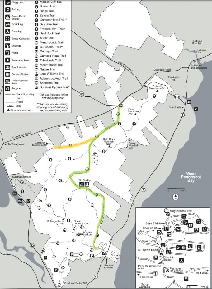 The draw to Camden Hills is usually Maiden’s Peak or Bald Rock lookout – but rather than go for those classic views, I was looking to find flatter stretches with miles of good biking trails in this mid-coast part of the State. So starting from the campground (on the bottom of the Park’s map to the left), I plotted a route and headed out (in green, the Ski Shelter Trail), thinking maybe I’d have time on the way back for the Cameron Mountain spur (in yellow) – it had been highly recommended to me by Park staff.