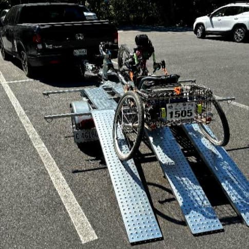 I’ll also share a transport adaptation that some might find helpful. I drive with hand controls and am not able to lift my bike, so with the help of a friend who is handy at metalwork, I retrofitted my trailer with a rack underneath to hold three ramps that I pull out for loading and unloading.