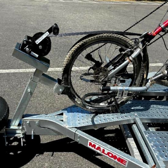 Then to enable getting the bike up and down the ramps I added a hand-winch from a boat trailer and it just cranks right up. The strap holds the front wheel snugly in place and all I have to do is strap down the back wheels for tight transport:
