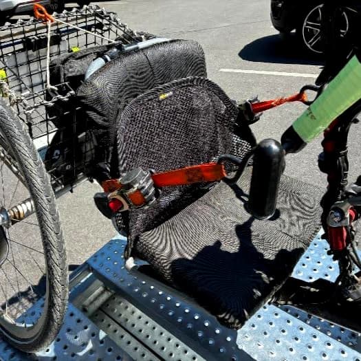 One other mechanical part of this, that some hand cyclers may need to tend to, is steadying the chassis. Left alone it will want to flop left or right with any jostling in transport, so I use tie-downs to keep it centered, with tension heading backwards behind the seat: