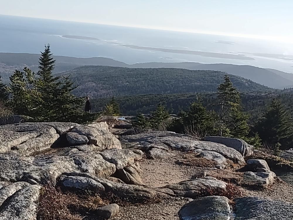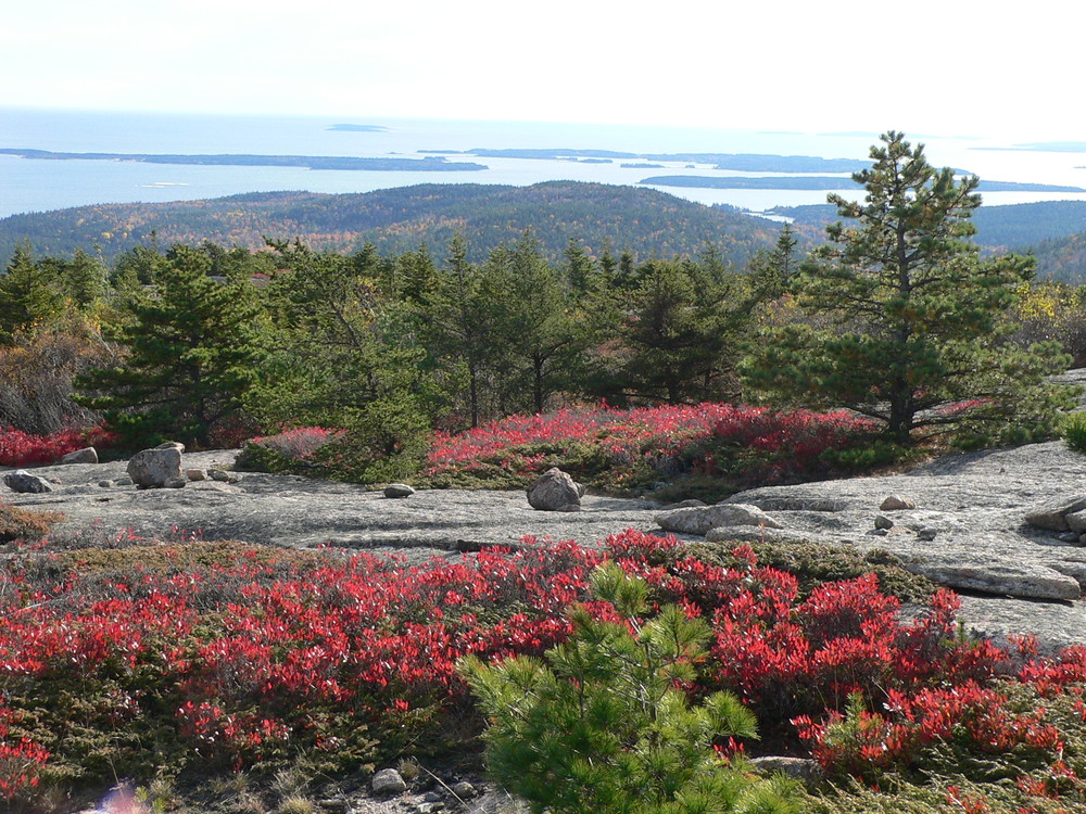 The South Ridge of Champlain Mountain crosses beautiful open granite expanses with views of the Cranberry Isles and other islands to the south. It passes through stunted gnarly pitch pines. Expect to be delayed in your hike during August as you stop to browse on blueberries. Pause also to enjoy the Bowl, a peaceful pond nestled behind the Beehive.