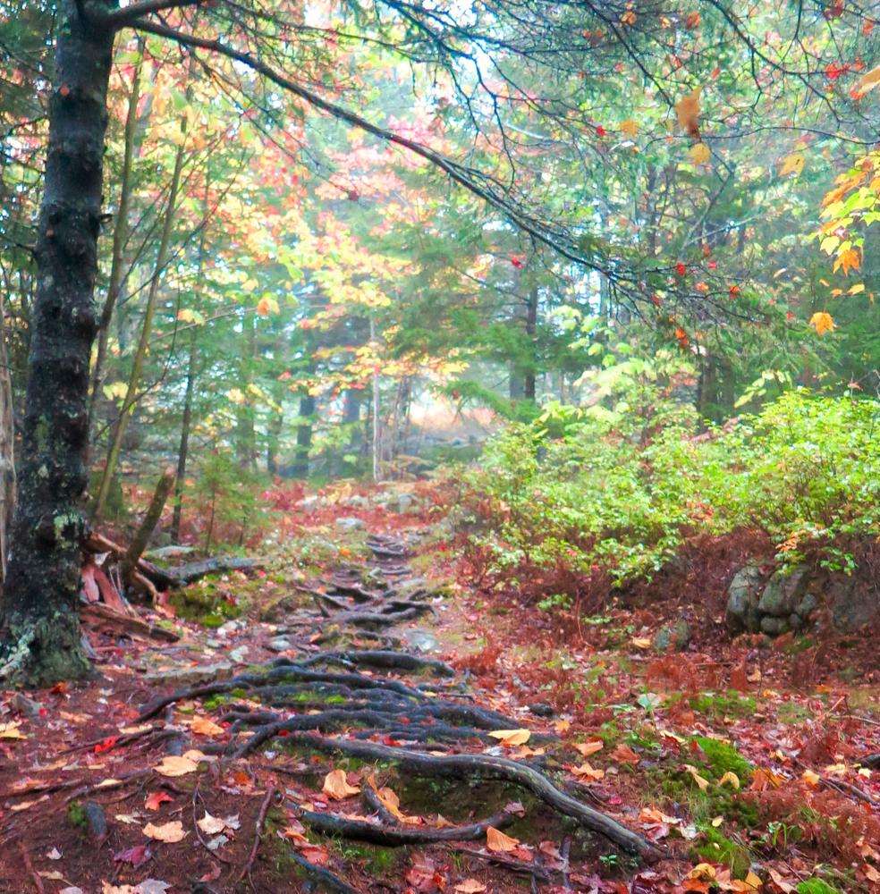 The Bernard Mountain trail leaves Great Notch to the left (west), steeply climbing up the side of the mountain over cliffs and tree roots. It meets up with the Sluiceway Trail on the left after 0.4 miles. Just beyond is a view point on the right, overlooking the western-most portions of Mount Desert Island. The views are somewhat impeded by the recent growth of some newer hemlock trees. From this overlook, it is a relatively flat 0.1 miles to the forested summit.