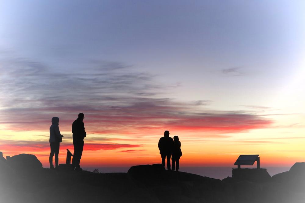 At 1,530 feet Cadillac Mountain is the tallest mountain on the eastern seaboard of the United States. The true summit is to the left where the South Ridge Trail opens onto the gravel access road. Look for 2 survey benchmarks established by the US Coast and Geodetic Survey in 1856 and the 1954 US Geological Survey summit marker. To the east of the true summit is where one of several summit hotels stood in the 1880s. Please explore the area carefully, staying on the granite and leaving what you find for others to enjoy.