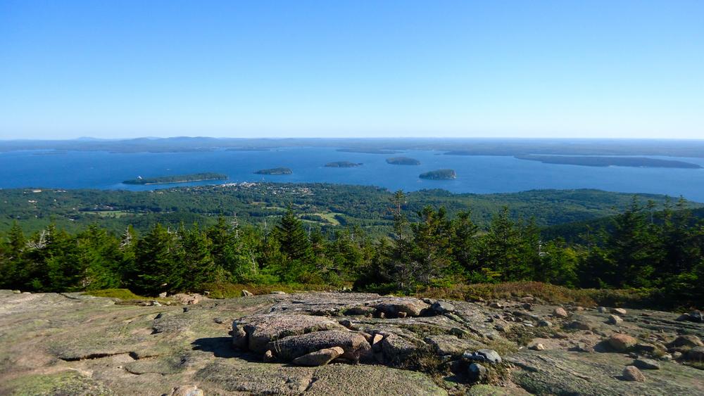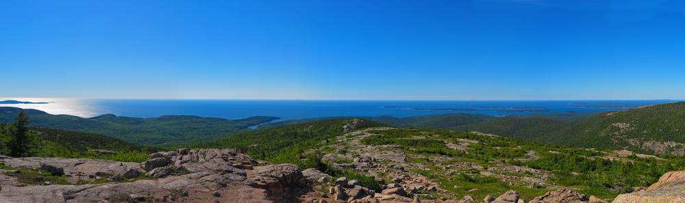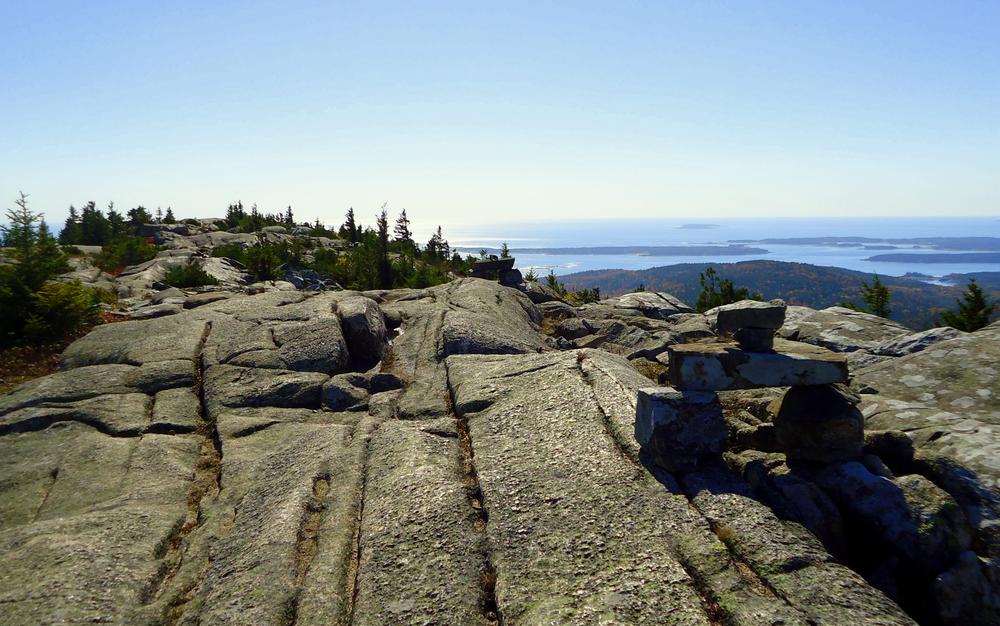 The trail begins up a moderate ascent through sparse forested areas. It quickly begins to open up, as it climbs more steeply over granite ledges, and through ocassional stunted red pine trees. Once out of the trees, there are views to be had for almost the entirety of the trail along the ridge, to the north and east overlooking Frenchman Bay, the Porcupine and other islands, the Schoodic Peninsula across the Bay, and down to the village of Bar Harbor below.