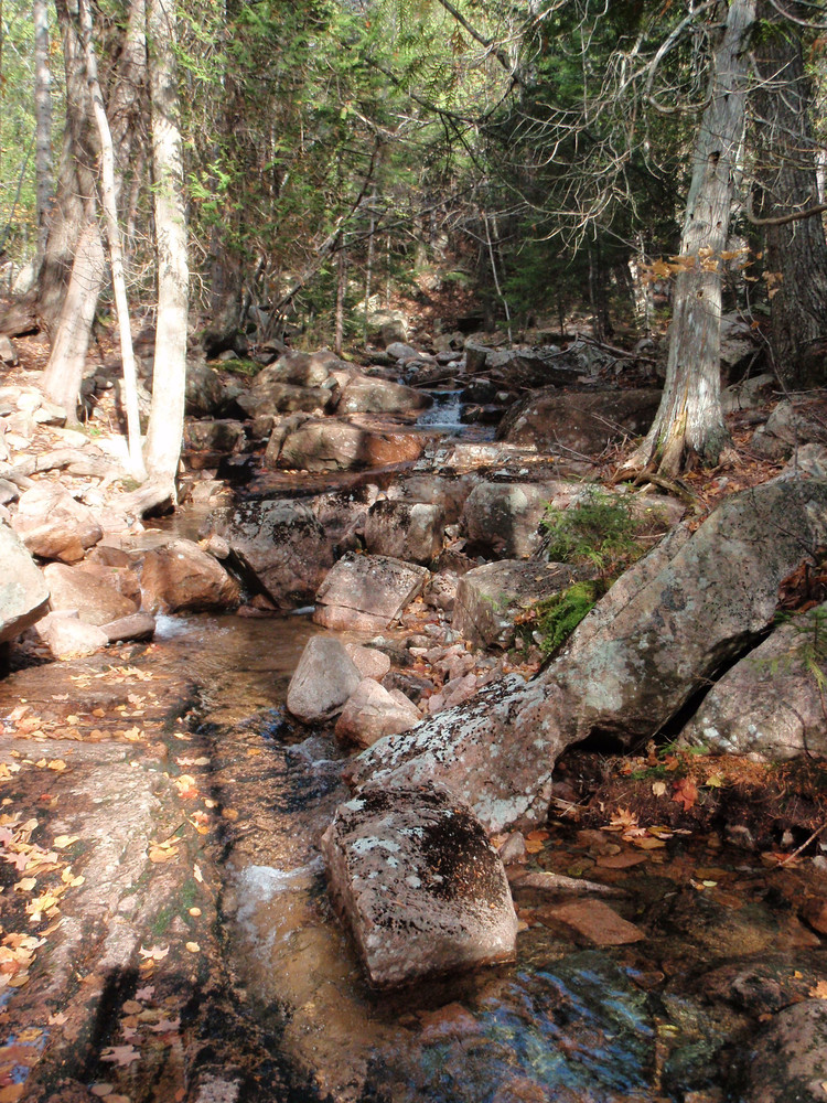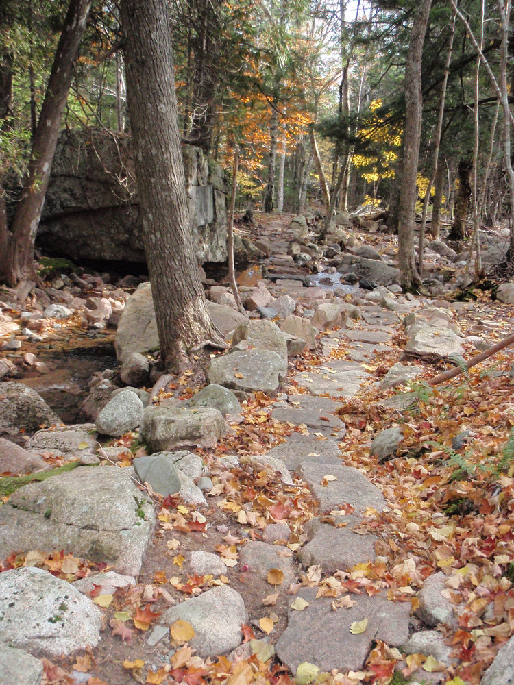 Before descending, the trail offers spectacular views of the ocean and offshore islands in the distance. The descent becomes rugged as it drops over large rocks and boulders, becoming more gradual as it follows a stream through the forest. Historic stone paving and steps along the way provide a moderate to easy walk. The trail terminates at the junction of the Canon Brook Trail. A left on Canon Brook leads through the forest and past the Dorr South Ridge Trail junction. To complete the hike, retrace the route back to the parking area.