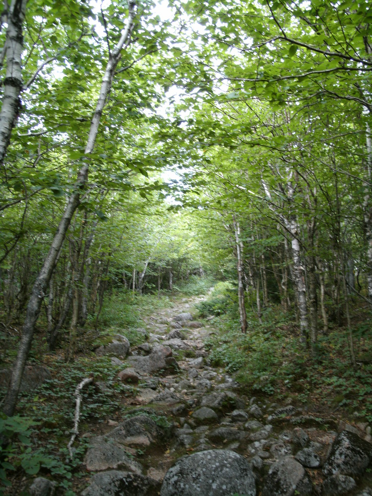 Continuing past the summit, the trail junctions with the Schiff Path and the North Ridge Trail. The hike turns left and is a steep and rugged descent into the valley between Cadillac and Dorr Mountains. At the junction known as The Notch, the A. Murray Young Path is to the left (see note below).