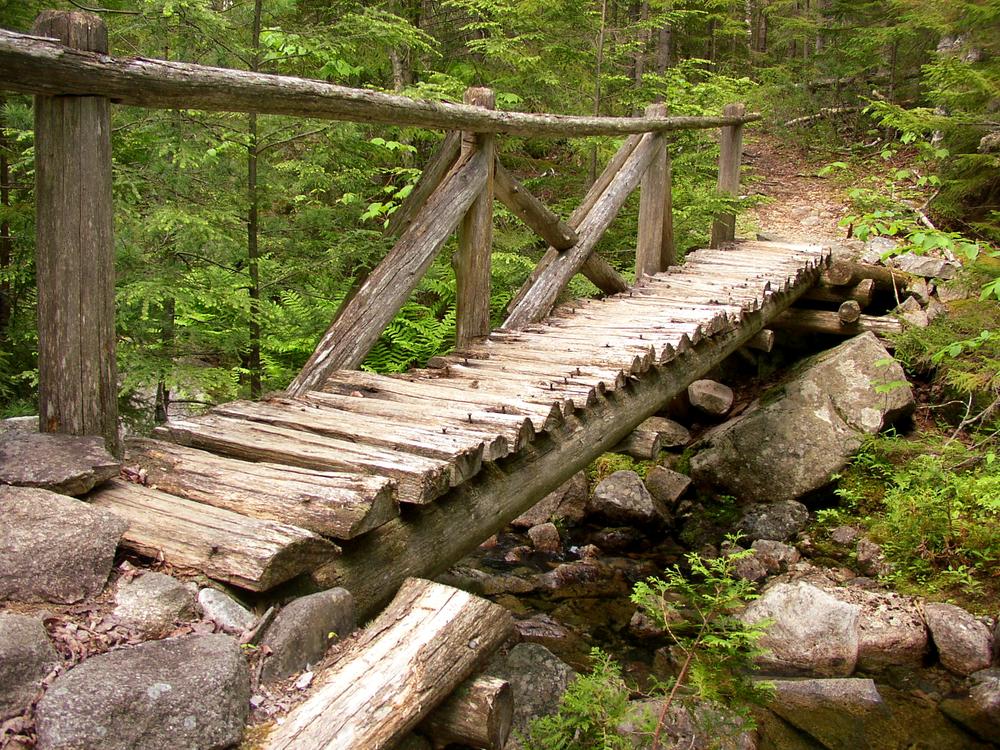 At Great Notch, there are split log benches upon which to rest, and a register in which you can add your comments. Steep trails to the right and left lead to the summits of Mansell Mt and Bernard Mt, respectively. The loop continues straight ahead on the Great Notch Trail. The Great Notch Trail descends, at first moderately and then gradually, 0.4 miles to a trail junction; the loop continues to the right. This section of trail includes sections that have been recently rebuilt with stone steps to ease the descent. The trail emerges at the shores of Long Pond 0.8 miles from Great Notch, and follows the west shore of the pond 1.5 miles back to the parking lot.