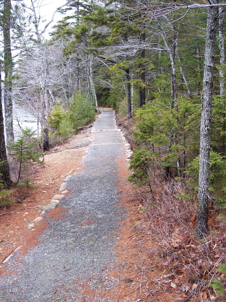 Starting from ME Route 3, turn off at the Hulls Cove Entrance to Acadia National Park and the Hulls Cove Visitor Center. Follow the Park Loop Road. At 2.8 miles continue straight remaining on the two-way section of the Loop Road following signs for Jordan Pond. Use the North Lot parking area on the right just before the Jordan Pond House. Walk down the boat access to the pond. The Jordan Pond Trail crosses the boat launch. The hike can be taken in either direction.