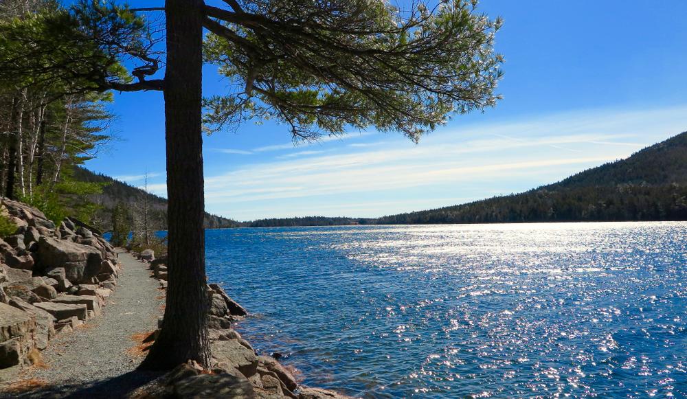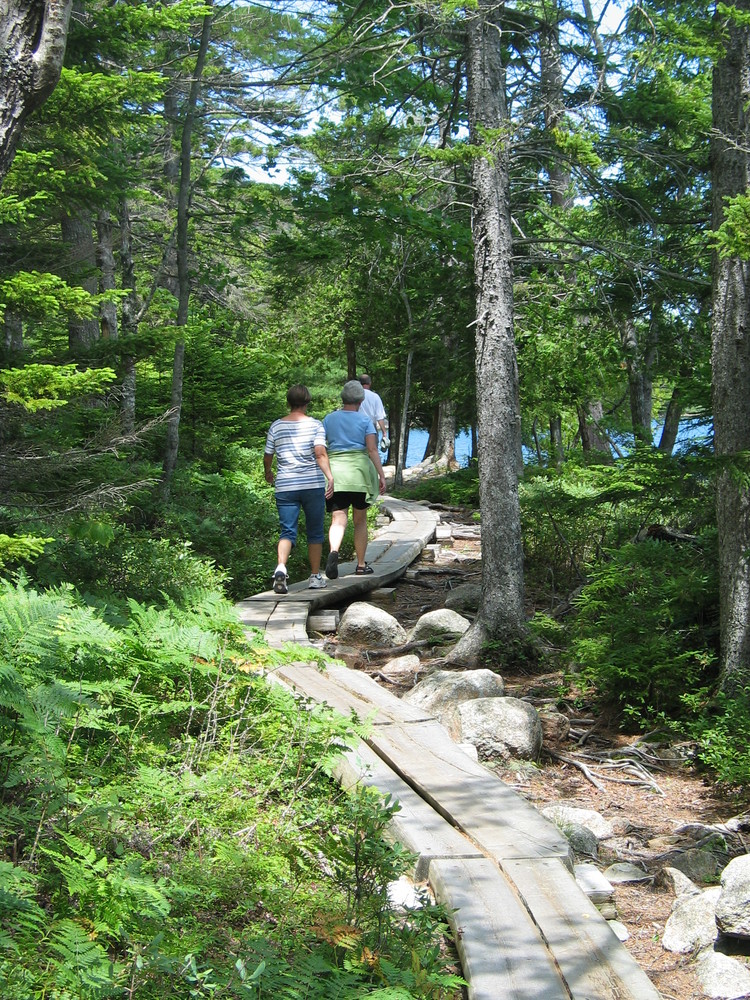 After reaching the pond, a right turn on the Jordan Pond Path goes along the east side first, which is an easy walk on a compact surface. A left on the trail travels the west side first, mostly on a long section of wooden planks over a boggy area. (Stay on the planks to avoid damaging the fragile plants below.) The north end of the west side is rugged as it traverses uneven granite. Because it's a loop, the hike can be taken in either direction.