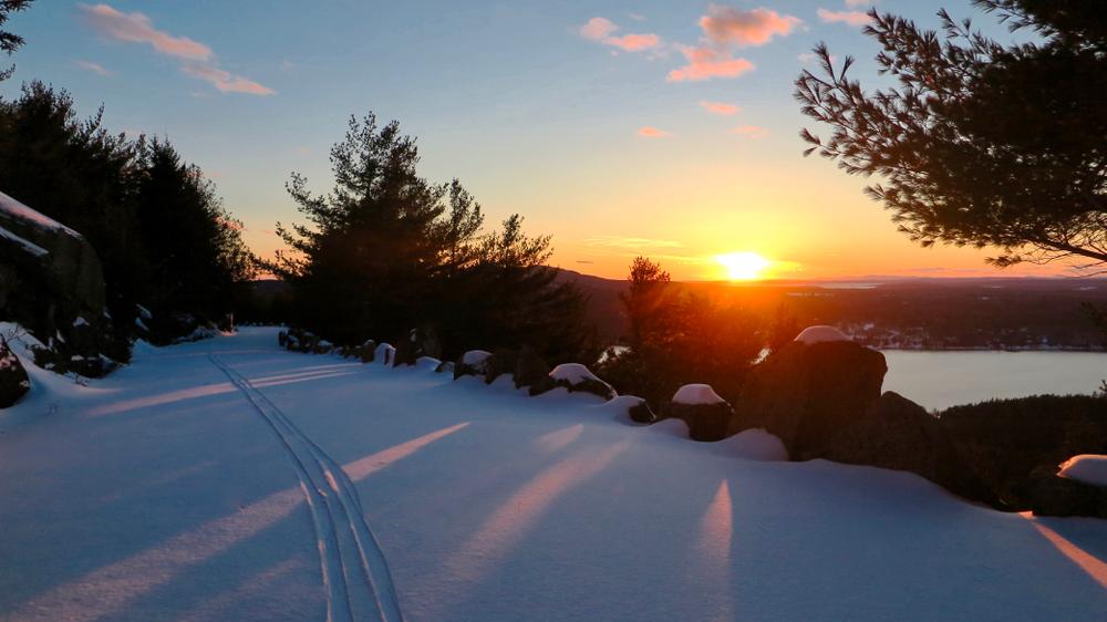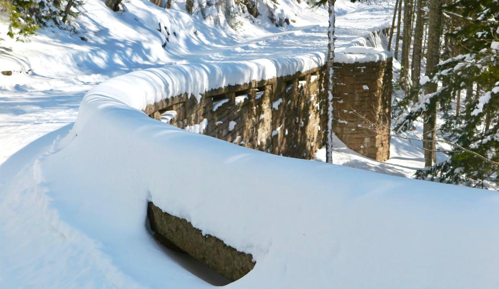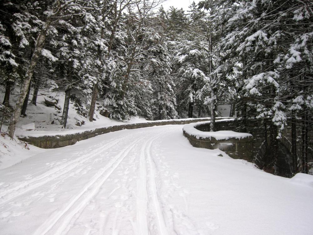 The pristine crushed-stone surfaces of Acadia’s carriage roads make them ideal for cross-country skiing in wintertime. Add the park’s spectacular scenery and trail grooming by the volunteers of the Acadia Winter Trails Association (consult the Winter Trails Association page of the Friends of Acadia website for current grooming status), and it’s no wonder that skiing is a highlight of the season for many area residents and winter visitors alike. The network of trails provides routes for all abilities, from short flat routes to longer treks up mountainsides. The following are among the most popular routes.