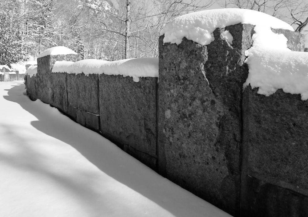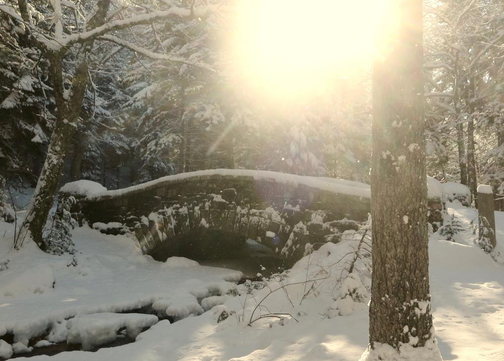 This loop is best started from the Brown Mountain Gatehouse or the Parkman Mountain parking lot. From the Gatehouse, a very short stretch of carriage road leads to the first real junction (#18). For a counter-clockwise circuit from the Gatehouse, the loop starts on the Amphitheater route as described above. At junction #21, instead of heading left around the amphitheater, the Around Mountain Loop heads right. This 1 mile stretch cuts across to Jordan Pond, crossing over two photogenic stone bridges, with some views through the bare deciduous trees. The route takes a left at junction #14, at south end of Jordan Pond. It continues north for 2 miles, with open views of Jordan Pond to the right (east) for the length of the pond.