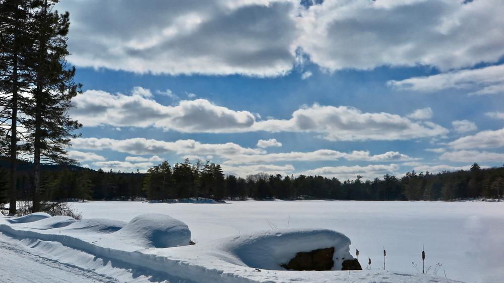 The route proceeds to the left at the next two junctions (#10N & #10S), one following just after the other, and then after only 0.1 miles to the left again (#8). A long, moderate descent is the reward for the climb up Seven Bridges. After just under 1 mile the route reaches the southern end of Eagle Lake on the right, and proceeds over mostly flat terrain the final mile back to the parking lot. Please note that because of the exposure by the lake, this section often has many hummocks over which to traverse, created in the snow by the wind.