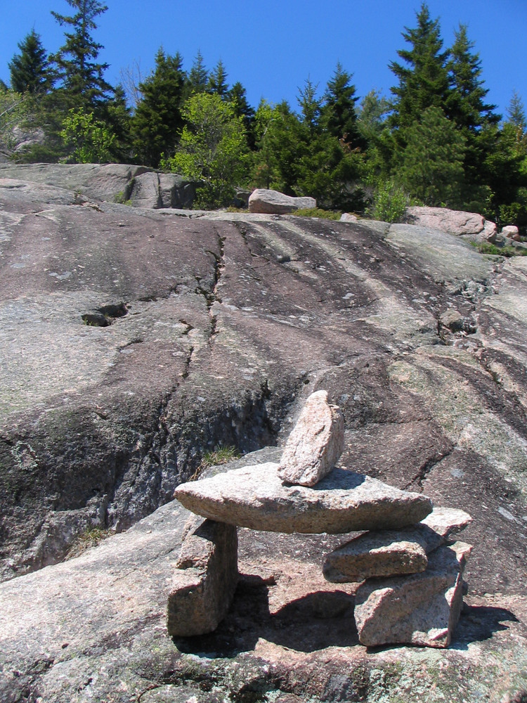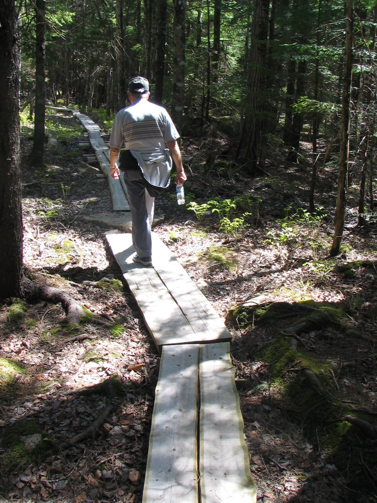 Continuing onto North Bubble, the trail becomes steep with open granite ledges and will be slick in wet weather. There are excellent views of Jordan Pond, Pemetic and Sargent Mountains, and the Cranberry Isles. After the North Bubble summit, the trail turns north providing unique views of Eagle Lake and the northern portion of the island before descending into the forest. When the trail crosses the carriage road, the hike continues to the right along this non-motorized crushed stone road. Stay to the right to allow bikers and equestrians to safely pass. In approximately 0.6 miles, look for a path and small wood foot bridge in the forest on the right. This is the Jordan Pond Carry Trail. When the trail intersects the carriage road, turn right. The Carry Trail passes through a deciduous forest. Portions of the trail have wooden planks to avoid wet sections. The trail gently rises until it reaches the junction with the Bubbles Divide Trail. A left at this junction leads back to the parking lot.
